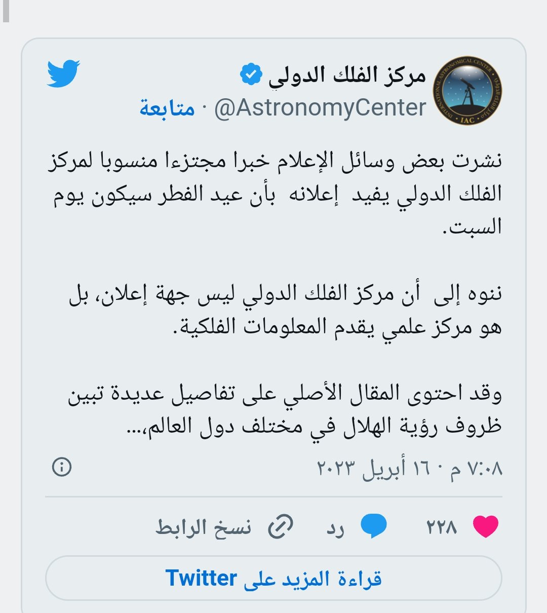 تداولت بعض وسائل الإعلام ورواد مواقع التواصل الاجتماعي معلومات فلكية تفيد بتعذر رؤية هلال شهر شوال، الخميس المقبل، سواء بالعين المجردة أو بالتلسكوب من أي مكان في العالم، وأن السبت هو أول أيام عيد الفطر المبارك.