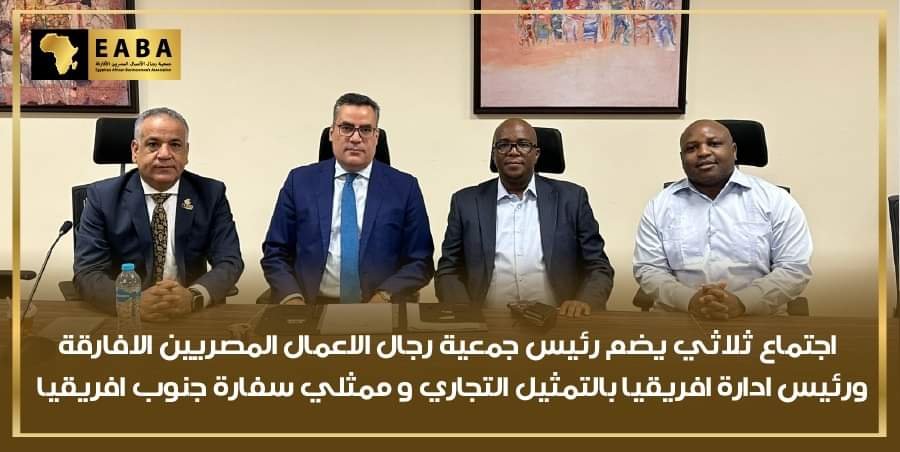 التقى الدكتور يسري الشرقاوي، رئيس جمعية رجال الأعمال المصريين الأفارقة، بالسيد علي محمد باشا، مدير إدارة أفريقيا في جهاز التمثيل التجاري، بالإضافة إلى وفد رفيع المستوى من البعثة الدبلوماسية لجنوب أفريقيا في القاهرة. تم عقد الاجتماع في مقر وزارة التجارة والصناعة وجهاز التمثيل التجاري بالعاصمة الإدارية.
