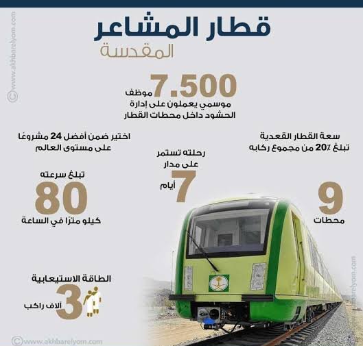 وأوضحت أنه تم نقل هذا العدد الكبير من الحجاج خلال أيام التشغيل الفعلي لقطار المشاعر المقدسة والبالغ عددها سبعة أيام والتي انطلقت في اليوم السابع من شهر ذي الحجة وصولاً إلى نهاية عملية النقل التي انتهت اليوم الثالث عشر من ذي الحجة آخر أيام التشريق.