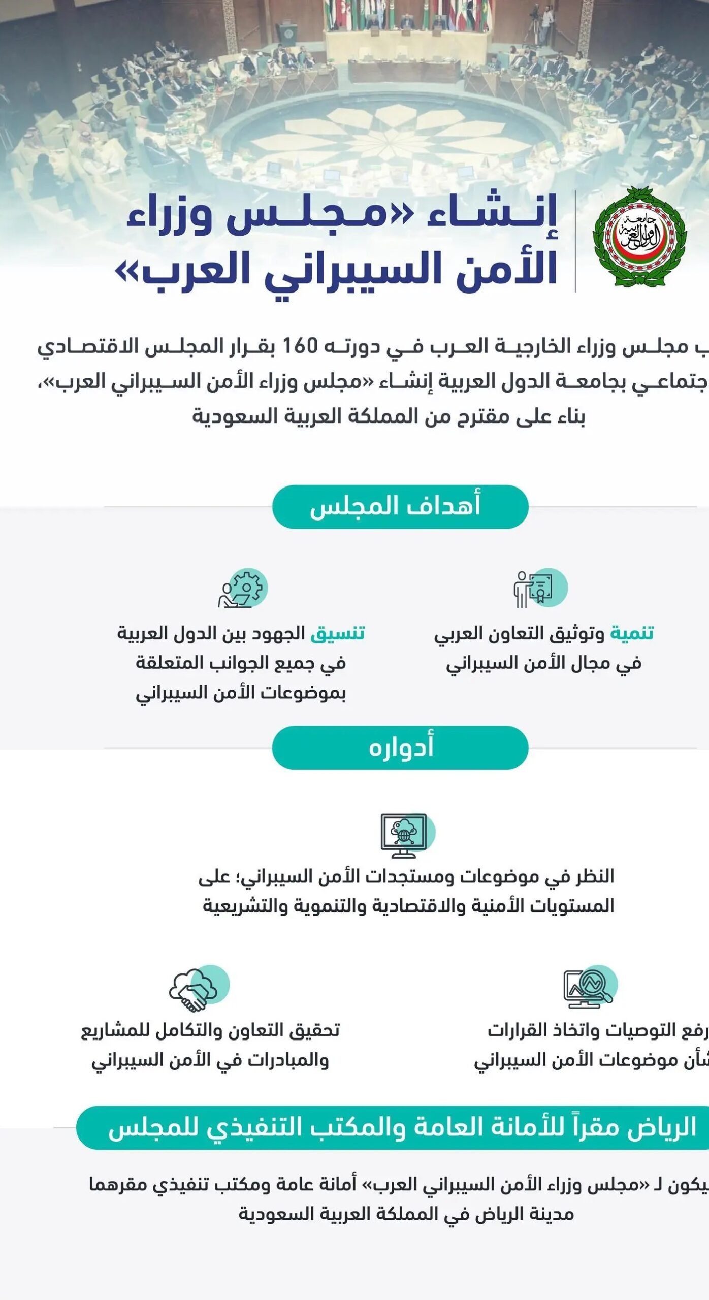 رحب مجلس وزراء الخارجية العرب في دورته ١٦٠ بقرار المجلس الاقتصادي والاجتماعي بجامعة الدول العربية إنشاء “مجلس وزراء الأمن السيبراني العرب”، بناء على مقترح من المملكة العربية السعودية؛ ويهدف المجلس إلى تنمية التعاون وتوثيقه، وتنسيق الجهود بين الدول العربية في جميع الجوانب المتعلقة بموضوعات الأمن السيبراني، وسيكون للمجلس أمانة عامة ومكتب تنفيذي مقرهما مدينة الرياض بالمملكة العربية السعودية.