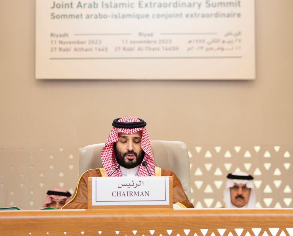 يأتي انعقاد هذه القمة في ظروف استثنائية ومؤلمة، ونؤكد في هذا الصدد إدانتنا ورفضنا القاطع لهذه الحرب الشعواء التي يتعرض لها أشقاؤنا في فلسطين وراح ضحاياها الآلاف من المدنيين العزل ومن الأطفال والنساء والشيوخ، ودمرت فيها المستشفيات ودور العبادة والبنى التحتية.
