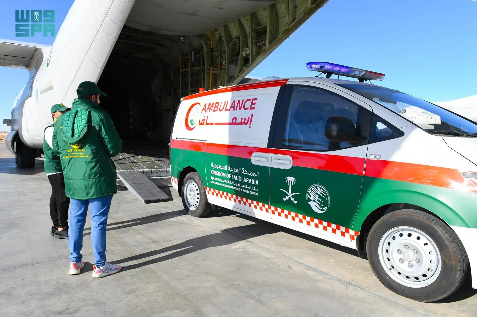 وتحمل الطائرة على متنها سيارتي إسعاف، تمهيداً لنقلها إلى المتضررين من الشعب الفلسطيني داخل قطاع غزة.