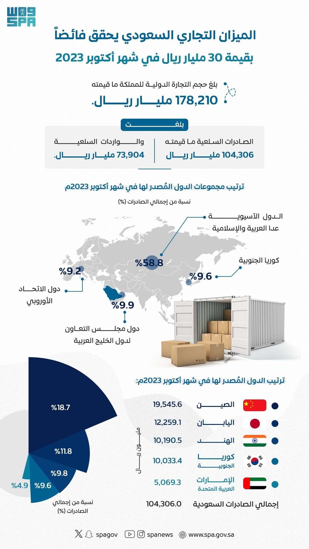 وبلغت الصادرات السلعية ما قيمته 104,306 مليارات ريال من إجمالي حجم التجارة، في حين بلغت الواردات السلعية 73,904 مليارات ريال، لتتصدر بذلك مجموعة الدول الآسيوية عدا العربية والإسلامية، مجموعات الدول المُصدر لها في شهر أكتوبر، لتستحوذ على ما نسبته 58.8% من إجمالي الصادرات السلعية السعودية بقيمة 61,367 مليار ريال.