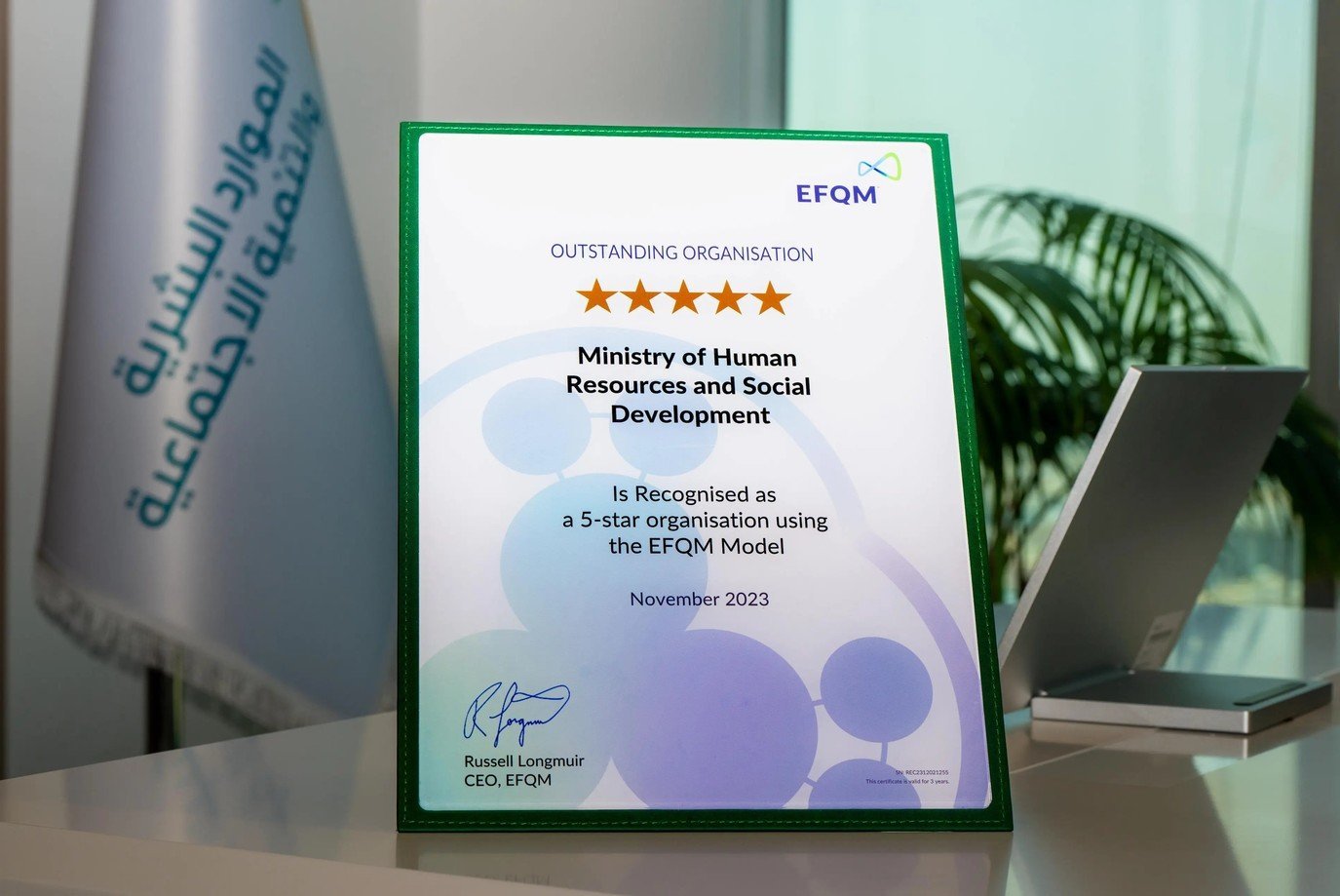 حصدت وزارة الموارد البشرية والتنمية الاجتماعية على شهادة الاعتراف بالتميز المؤسسي بمستوى 5 نجوم كأول وزارة على مستوى المملكة العربية السعودية خلال العام 2023 م وفقًا لنموذج التميز الأوروبي الصادر من المنظمة الأوروبية لإدارة الجودة (EFQM)، وذلك نظير جهود الوزارة وسعيها المستمر في تطبيق النهج المتكامل لرحلة التميز المؤسسي نحو الابتكار والإبداع ورفع كفاءة الأداء ومخرجات الأعمال.