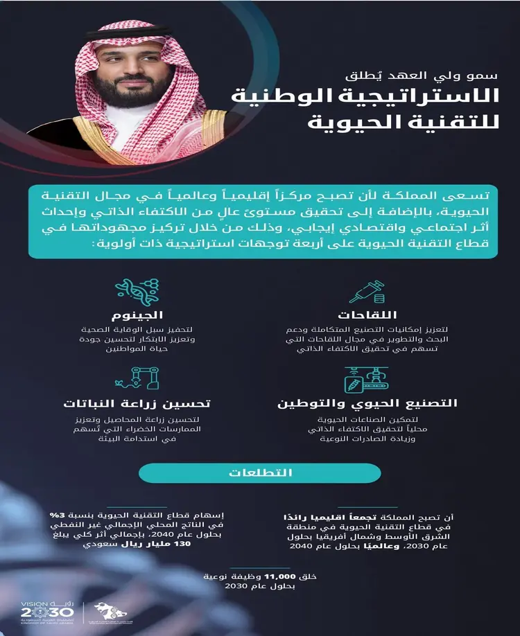 اطلق صاحب السمو الملكي الأمير محمد بن سلمان بن عبدالعزيز آل سعود، ولي العهد رئيس مجلس الوزراء – حفظه الله -، الاستراتيجية الوطنية للتقنية الحيوية، التي تهدف إلى تعزيز مكانة المملكة كدولة رائدة في القطاع، وستركز الاستراتيجية على تحسين الصحة الوطنية ورفع مستوى جودة الحياة، بالإضافة إلى حماية البيئة وتحقيق الأمن الغذائي والمائي، وتعظيم الفرص الاقتصادية وتوطين الصناعات الواعدة؛ مما سيسهم في تحقيق مستهدفات رؤية المملكة 2030.