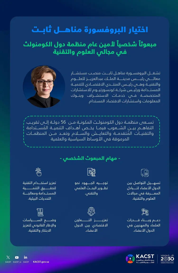 وستُسهم خبرتها الموسعة وحصيلتها الاتصالية والعلمية في تحديث المنظومة التقنية والعلمية لمنظمة دول الكومنولث، وبناء جسور التعاون في مجال العلوم والتقنية بين الدول الأعضاء والدول الأخرى كالمملكة العربية السعودية وبقية الدول، مما سينعكس على ازدهار بلدان الأعضاء والدول الأخرى.