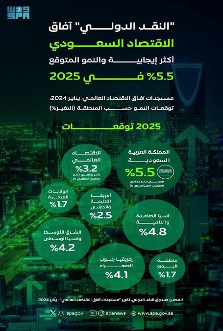 رفع صندوق النقد الدولي من توقعاته الصادرة حديثاً حول نمو الاقتصاد في المملكة العربية السعودية ، حيث قام بزيادة توقعاته الإيجابية لأداء الاقتصاد في المملكة من 4.5% في العام 2025 إلى 5.5%، وذلك خلاف توقعاته الصادرة بتقريره السابق في شهر أكتوبر من العام 2023.