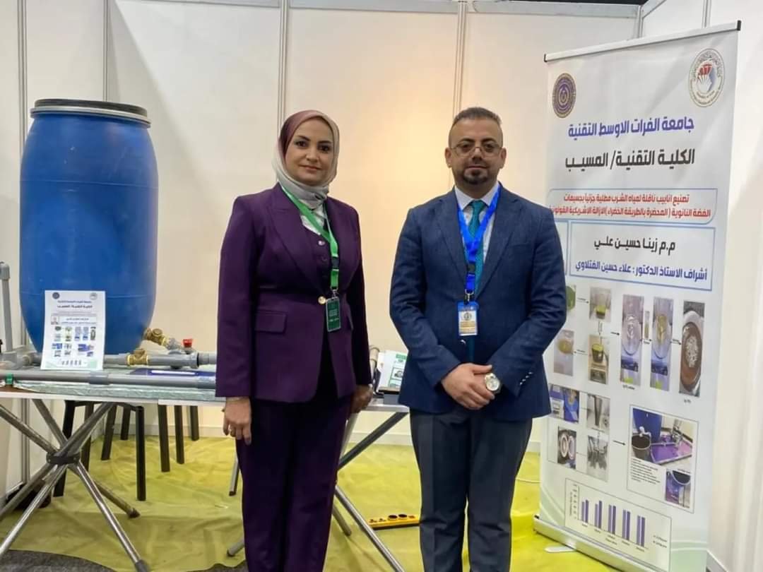 شاركت المدرس مساعد زينة حسين علي من الكلية التقنية المسيب بجامعة الفرات الأوسط التقنية، في المؤتمر الدولي الثاني لمستقبل الطاقة المستدامة الذي عقد بجامعة المستقبل، بمشروعها البحثي الموسوم (تصنيع أنابيب ناقله لمياه الشرب مطلية جزئيا بجسيمات الفضة النانوية، المحضرة بالطريقة الخضراء لازالة الاشريكية القولونية (E.coli)،