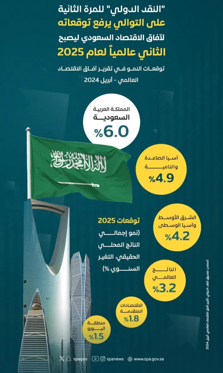 يشار إلى أن خبراء الصندوق قد توقعوا في يناير ٢٠٢٤م أن ينمو اقتصاد المملكة من ٤،٥% إلى ٥،٥% في العام ٢٠٢٥.