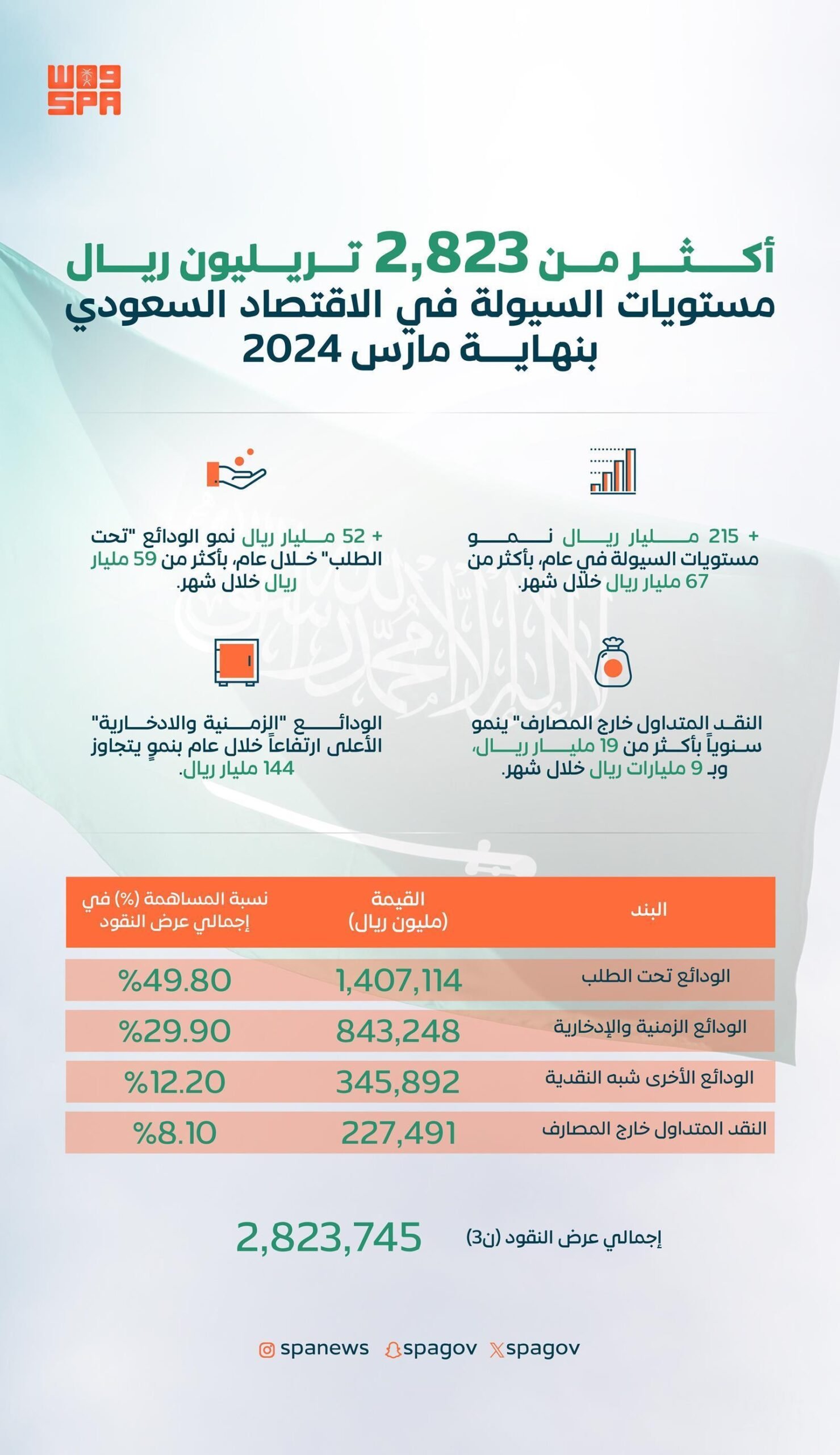 واصلت مستويات السيولة في منظومة الاقتصاد السعودي نموها القوي لتبلغ قمتها بنهاية شهر مارس 2024، عند مستوى 2,823,745 مليون ريال، محققة نمواً سنوياً بنسبة تقدر بـ 8.3% وبزيادة تجاوزت الـ 215 مليار ريال، مقارنة بنهاية الفترة المماثلة من العام 2023، والتي كانت 2,608,319 مليون ريال، حيث يعكس مستوياتها عرض النقود بمفهومه الواسع والشامل (ن3)، وذلك وفق ما أظهرته بيانات النشرة الإحصائية الشهرية للبنك المركزي السعودي لشهر مارس 2024.