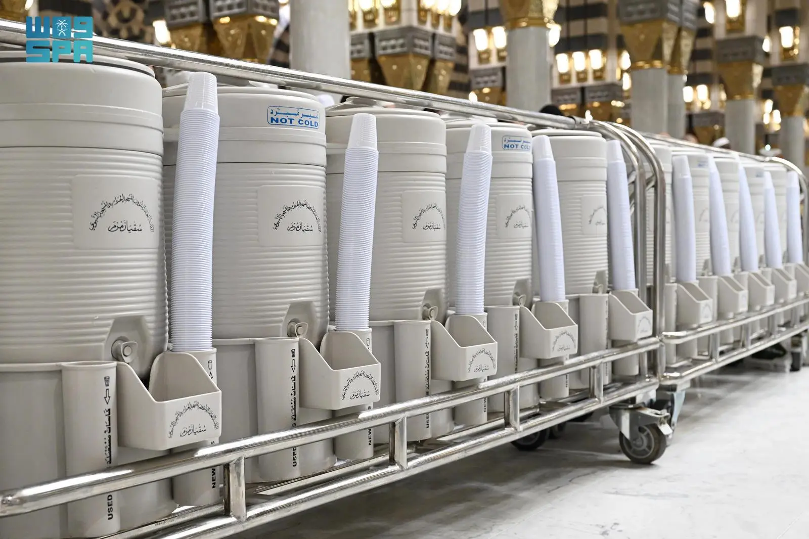 تعمل الهيئة العامة للعناية بشؤون المسجد الحرام والمسجد النبوي على توريد 300 طن من ماء زمزم يومياً عبر الصهاريج مخصصة تصل من مكة المكرمة إلى محطة التخزين بالمسجد النبوي مباشرة، بما يعادل 9000 طن شهرياً، لتأمين الكميات الكافية من المياه المباركة لسقيا الزائرين والمصلين بالمسجد النبوي.