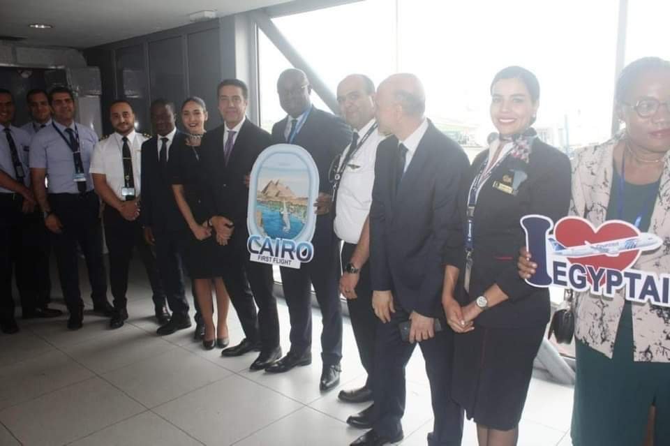 هذا، وقد كان في استقبالها كلا من السفير شريف سيف سفير جمهورية مصر العربية في ابيدجان، وأعضاء البعثة المصرية، والسفير الإيفواري بالقاهرة، وممثل وزير النقل الإيفواري، ومدير مطار ابيدجان، ومسئول شركة مصر للطيران، وممثلو العديد من شركات السياحة العاملة في كوت ديفوار، حيث قامت سلطات المطار هناك باستقبال الطائرة بتقليد رش المياه على الطائرة للترحيب بتشغيل هذا الخط الهام.