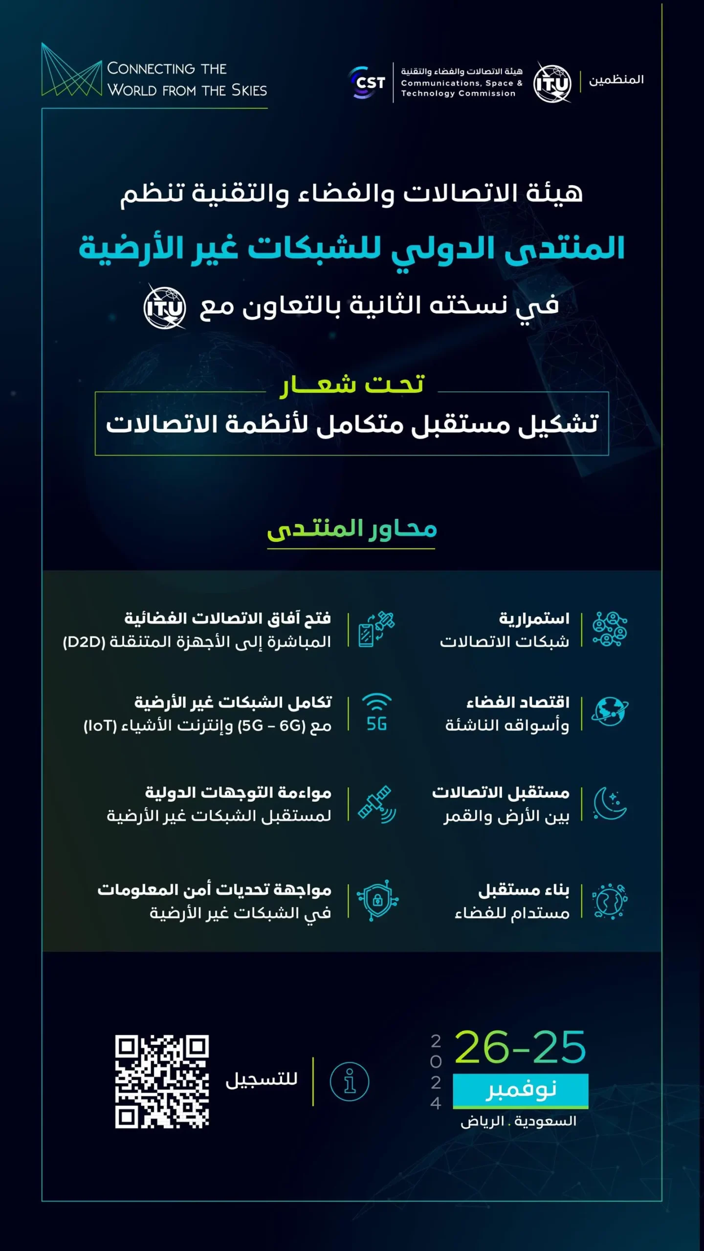 ويهدف المنتدى الذي يأتي تحت شعار “تشكيل مستقبل متكامل لأنظمة الاتصالات”، إلى مواكبة التطور المتسارع في توفير خدمات الاتصالات، والإسهام في توفير الحلول التقنية لخدمة البشرية وربط المناطق النائية، وتعزيز البحث والابتكار في تقنيات الشبكات غير الأرضية، إلى جانب تمكين بنية اتصالات تحتية صديقة للبيئة المستدامة، وتعزيز تنظيمات الشبكات غير الأرضية واستخداماتها في التحول الرقمي.