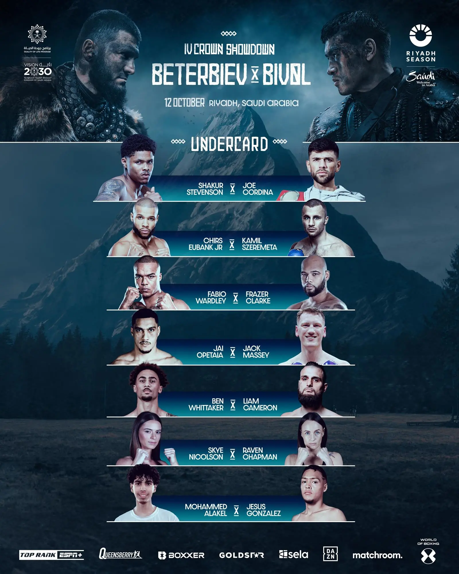 ويشهد الحدث سلسلة من النزالات المثيرة، إلى جانب هذا النزال الرئيسي الذي تضم نخبة من الأبطال العالميين في مختلف الأوزان في وزن السوبر فيذر (وزن الريشة الممتاز)، سيواجه الأمريكي شاكور ستيفنسون مع الويلزي جوكوردينا، وفي وزن المتوسط، يتحدى البريطاني كريس يوبانك جونيور صاحب الـ18 ضربة قاضية، البولندي كاميل سزيريميتا، في مواجهة تعد بالكثير من الإثارة.