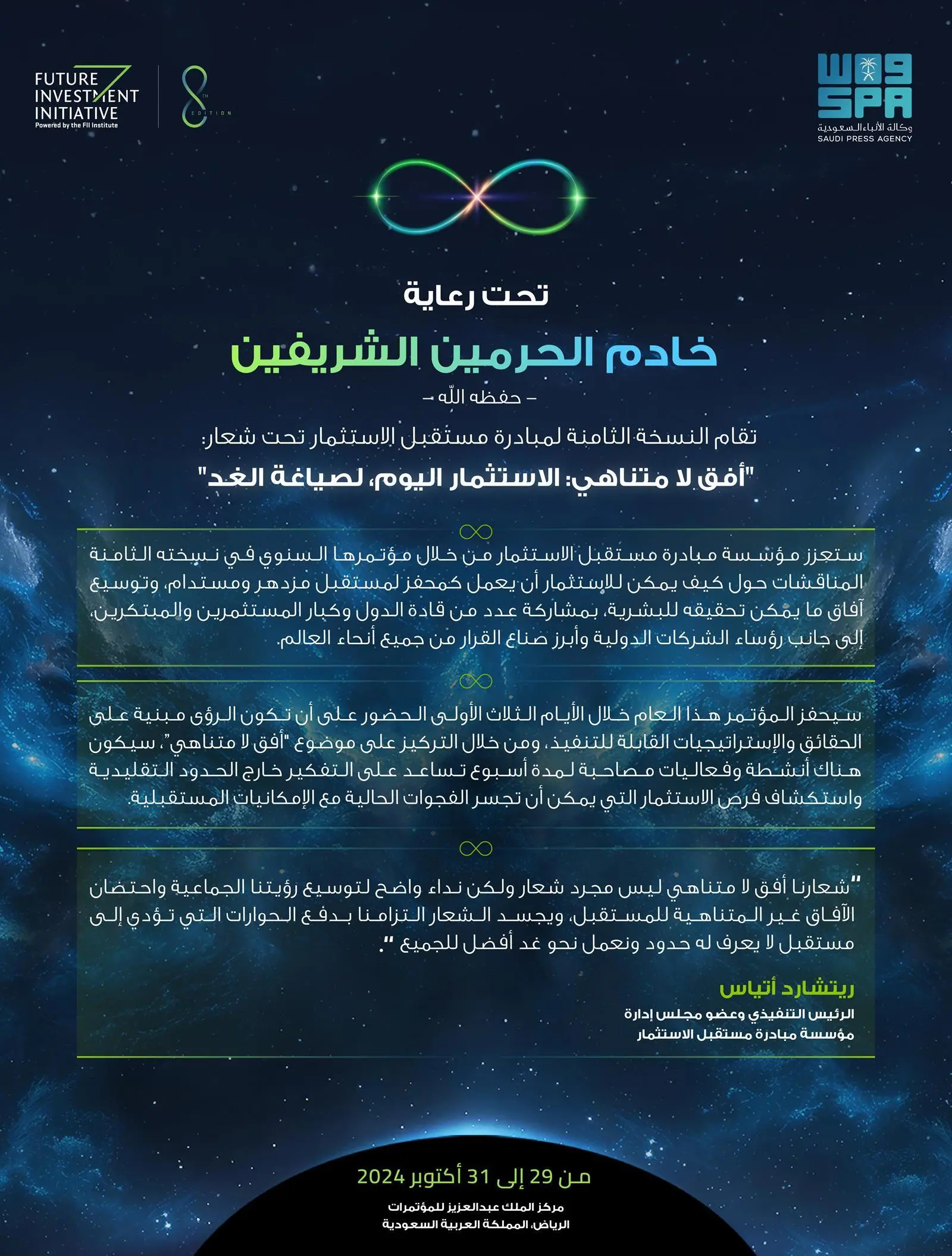تحت رعاية خادم الحرمين الشريفين الملك سلمان بن عبدالعزيز آل سعود – حفظه الله – يُعقد مؤتمر مبادرة مستقبل الاستثمار في الفترة من 29 إلى 31 أكتوبر 2024م، في مركز الملك عبدالعزيز الدولي للمؤتمرات بالرياض، تحت شعار ” أفق لا متناهٍ.. الاستثمار اليوم لصياغة الغد”.
