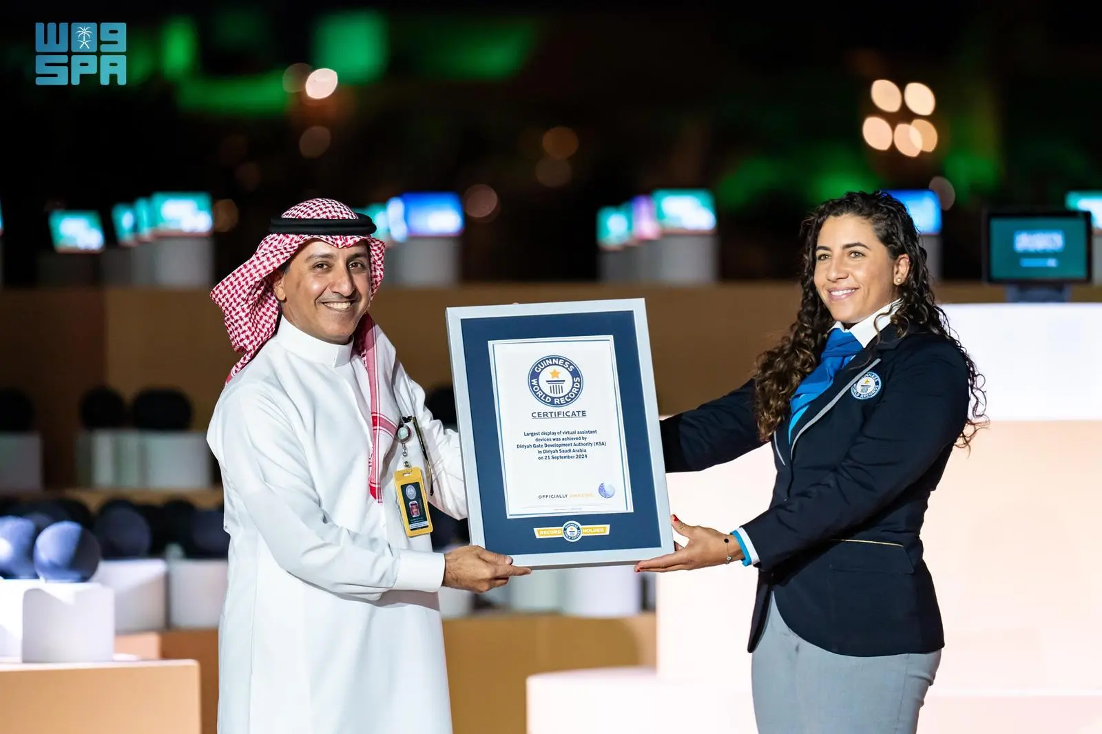 وأكدت المحكّم الرسمي المعتمد لدى غينيس للأرقام القياسية كينزي الضفرواي بهذه المناسبة بتحقيق أكبر عرض للمساعدات الافتراضية باستخدام 501 جهاز، في إنجاز استثنائي يجمع بين الابتكار التكنولوجي والإبداع، مشيره إلى إن هذا الإنجاز لا يمثل فقط رقمًا قياسيًا جديدًا، بل يجسد أيضًا التزام المملكة الراسخ بدمج الذكاء الاصطناعي مع الاحتفالات الثقافية.