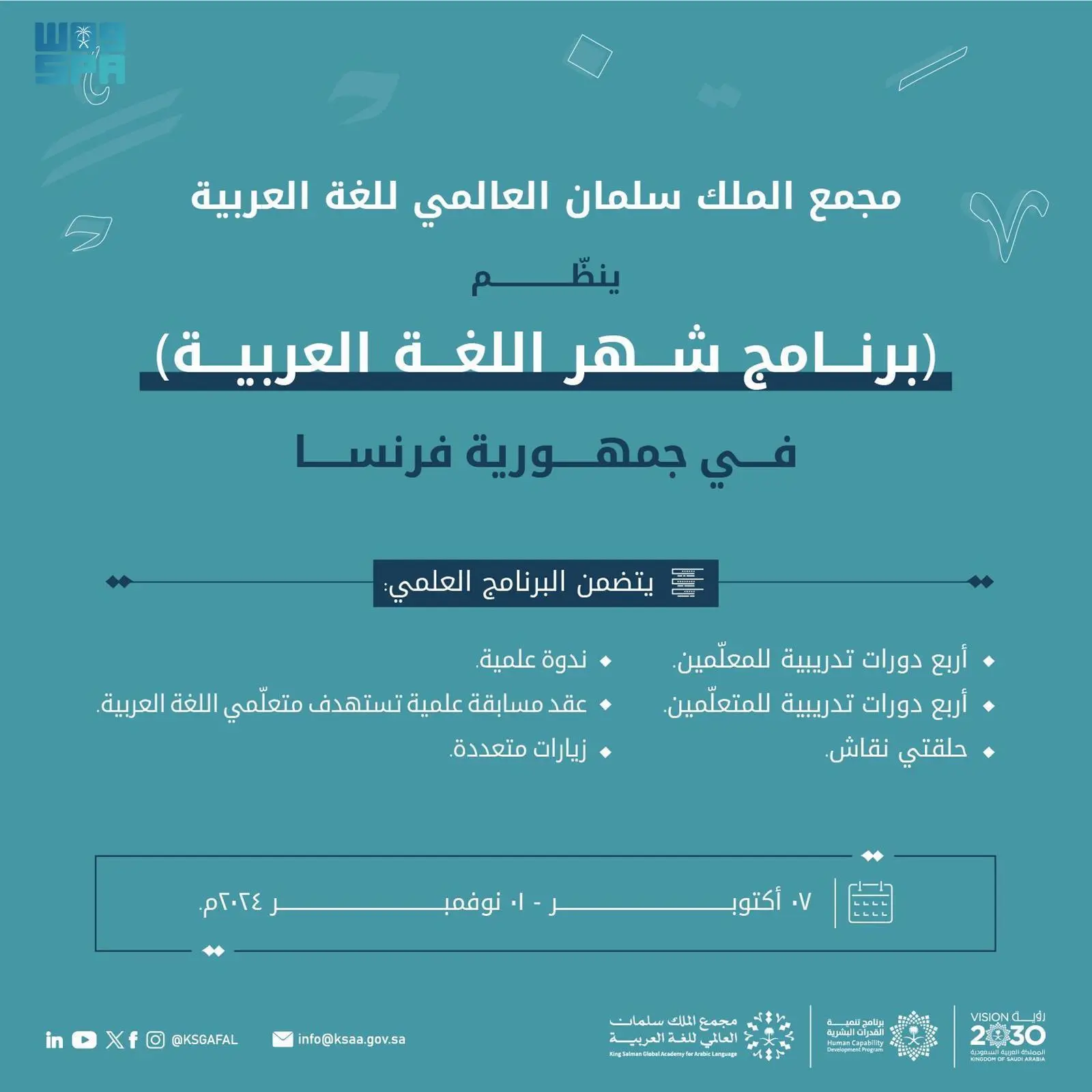يطلق مجمع الملك سلمان العالمي للغة العربية في المدة من ٧ أكتوبر إلى ٢ نوفمبر المقبل “برنامج شهر اللغة العربية في جمهورية فرنسا” وهو برنامج علمي يتكوّن من مجموعة برامج وأنشطة علمية تقام بالتعاون مع عدة جهات تعليمية؛ لتطوير مناهج تعليم اللغة العربية، وتحسين أداء معلميها، وتعزيز وجودها، وبناء صورة إيجابية عنها، وإبراز جهود المملكة العربية السعودية المبذولة في هذا المجال، وفقًا لما يتماشى مع مستهدفات برنامج تنمية القدرات البشرية أحد برامج تحقيق رؤية المملكة 2030.