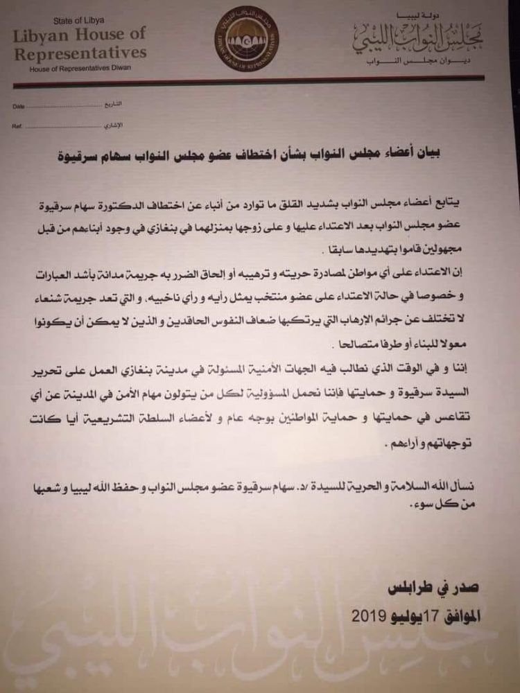 أدان مجلس النواب المنعقد في طرابلس واقعة اختطاف عضو مجلس النواب، سهام سرقيوة، مشيرًا إلى أن أعضائه يتابعون بقلق ما توارد من أنباء عن اختطافها، وذلك بعد الاعتداء عليها وعلى زوجها بمنزلها في بنغازي، في وجود أبنائهم من قبل مجهولين قاموا بتهديدها سابقًا.