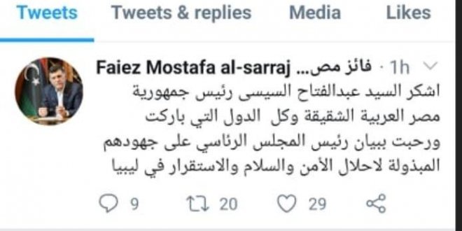 وقال السراج – في تدوينه على صفحته علي موقع تويتر اليوم الجمعة – “أشكر السيد عبدالفتاح السيسى رئيس جمهورية مصر العربية الشقيقة وكل الدول التى باركت ورحبت ببيان رئيس المجلس الرئاسي على جهودهم المبذولة لإحلال الأمن والسلام والاستقرار فى ليبيا”.