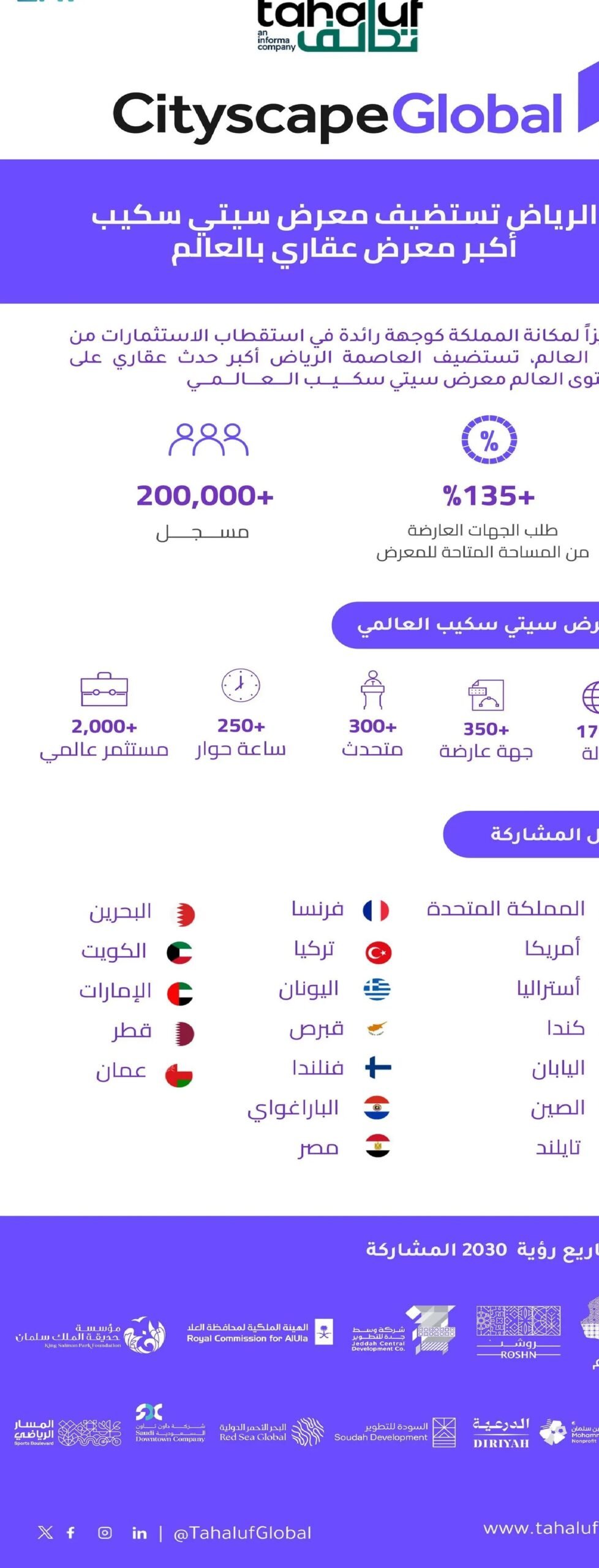 أكثر من 200 ألف مسجل في معرض سيتي سكيب العالمي الذي ينطلق اليوم في ملهم، بمشاركة العديد من الدول وكبرى مشاريع رؤية السعودية 2030