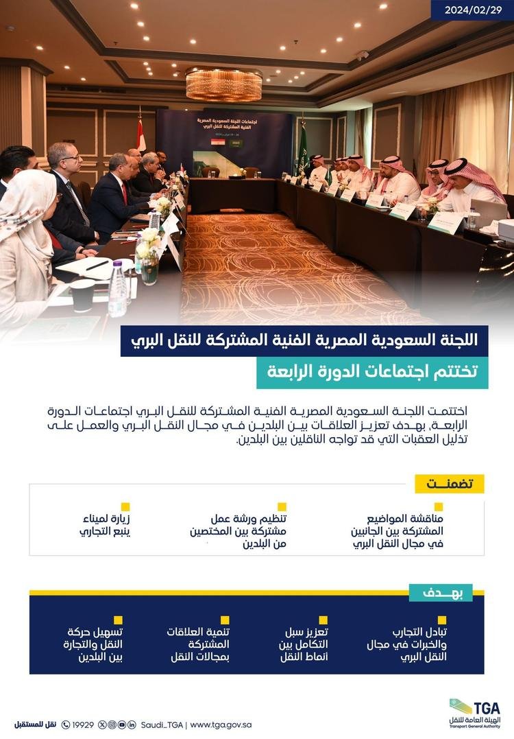 اختتمت اللجنة السعودية المصرية الفنية المشتركة للنقل البري اجتماعات الدورة الرابعة، بهدف تعزيز العلاقات بين البلدين في مجال النقل البري والعمل على تذليل العقبات التي قد تواجه الناقلين بين البلدين.