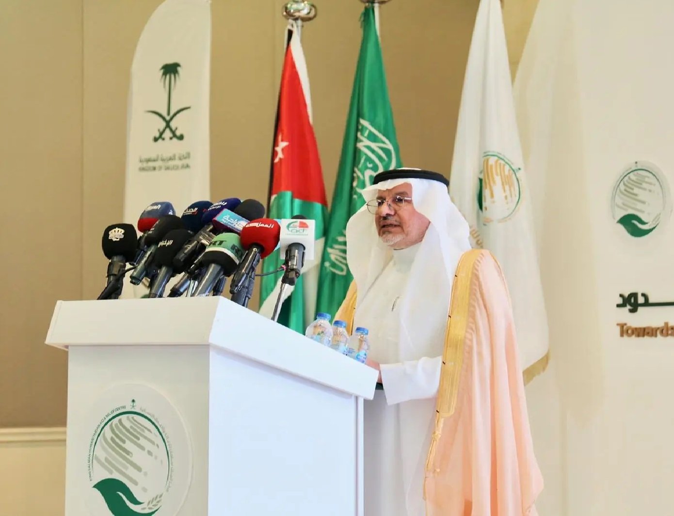 وأردف الدكتور الربيعة أنه امتداداً لهذا الدور فإننا نسعد اليوم بتوقيع وتدشين حزمة من مشاريع الأمن الغذائي والإيوائي والصحي للاجئين السوريين بتكلفة (19.478.038) دولاراً أمريكياً ليبلغ إجمالي ما تم تقديمه لهم سواء داخل المملكة العربية السعودية أو خارجها (6.141.595.375) دولاراً ، منها (162.358.892) دولاراً لتنفيذ 121 مشروعاً بالمملكة الأردنية الهاشمية، مبيناً أن الزيارة تأتي في ظروف صعبة يمر بها العالم والمنطقة العربية على وجه الخصوص؛ بسبب ما ألم بها من كوارث وأزمات، إلا أننا ندرك أن الشعوب المكلومة تعلق آمالها صوب المنظمات الإنسانية بوصفها الملاذ الآمن لها؛ ولكون منسوبيها يغامرون بأرواحهم في عمق المناطق المنكوبة وعلى الخطوط الأمامية بمناطق النزاع؛ سعياً لإنقاذ الأشخاص ومساعدة المحتاجين وحمايتهم دون مساومة على المبادئ الإنسانية التي يعملون لأجلها، مؤكداً أهمية الاضطلاع بمسؤولياتنا لدعم تلك المنظمات بما يمكنها من الوفاء بالتزامها تجاه المحتاجين، داعياً لتضافر جهود المجتمع الدولي لتوفير الضمانات الكافية لحماية فرق العمل الإنساني ضد الانتهاكات التي تمارس بحق العاملين في ميادين العمل الإنساني، مشدداً على أهمية حماية ودعم المدنيين العزل وخصوصاً الأطفال والنساء وكبار السن.