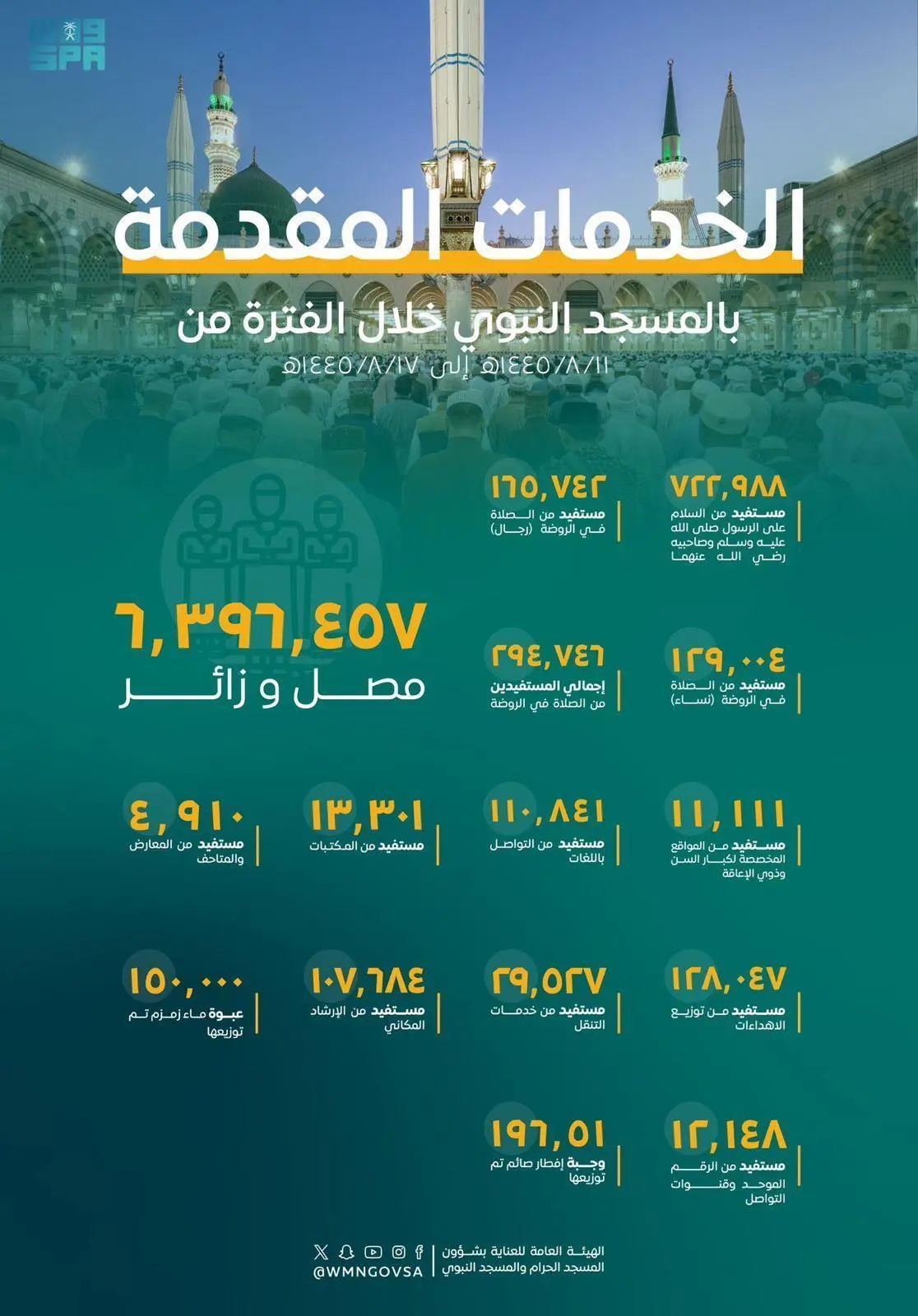 وأفادت الهيئة العامة للعناية بشؤون المسجد النبوي، أن (11.111) من كبار السن والأشخاص ذوي الإعاقة استفادوا من الخدمات المخصّصة لهم خلال الأسبوع الماضي، كما بلغ عدد المستفيدين من خدمات التواصل بعدة لغات (110841) زائراً من جنسيات مختلفة، فيما استفاد (13301) شخص من خدمة المكتبات، في حين استقبلت المعارض والمتاحف (4910) مستفيدين، كما قُدم (128047) إهداءً منوعاً للزائرين والزائرات، إضافة إلى (12148) خدمة إرشاد وتوجيه عبر الرقم الموحّد وقنوات التواصل، ضمن الخدمات المتاحة للعناية بالمصلين في المسجد النبوي.