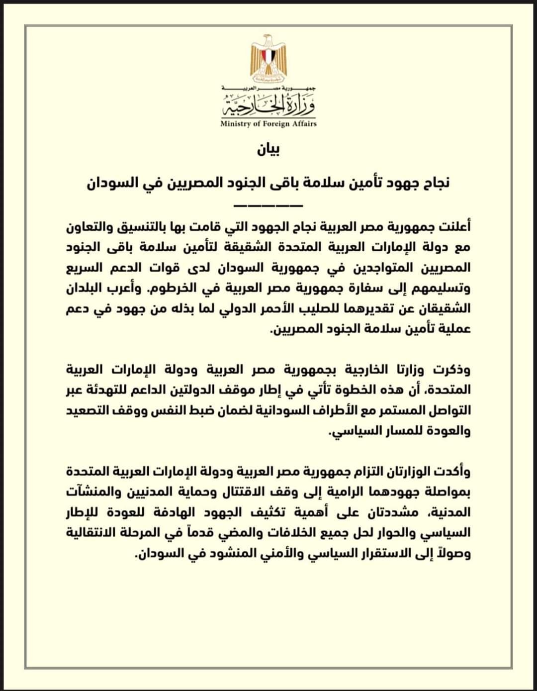 أعلنت جمهورية مصر العربية نجاح الجهود التي قامت بها بالتنسيق والتعاون مع دولة الإمارات العربية المتحدة الشقيقة لتأمين سلامة باقى الجنود المصريين المتواجدين في جمهورية السودان لدى قوات الدعم السريع وتسليمهم إلى سفارة جمهورية مصر العربية في الخرطوم. وأعرب البلدان الشقيقان عن تقديرهما للصليب الأحمر الدولي لما بذله من جهود في دعم عملية تأمين سلامة الجنود المصريين.