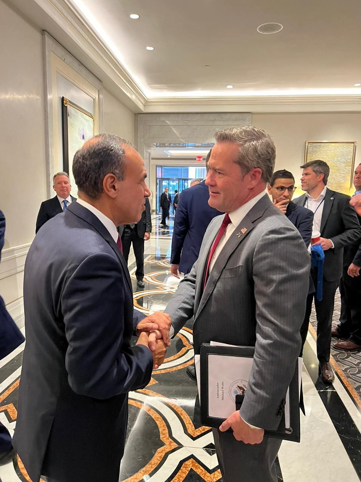 التقى د. بدر عبد العاطي وزير الخارجية والهجرة وشئون المصريين في الخارج بالسيد “مايكل والتز” المندوب الدائم الأمريكي لدى الأمم المتحدة ومستشار الأمن القومي الأمريكي السابق، وذلك على هامش أعمال الشق رفيع المستوى للجمعية العامة للأمم المتحدة، حيث جرى التأكيد على عمق علاقات التعاون بين مصر والولايات المتحدة في إطار الأمم المتحدة، والتنسيق الوثيق بين بعثتي البلدين في نيويورك، والاتفاق على مواصلة تعزيز التشاور إزاء القضايا ذات الاهتمام المشترك المطروحة على الساحة الدولية، وفي مقدمتها تعزيز السلم والأمن الدوليين، ودعم جهود حفظ وبناء السلام، والاصلاح والتطوير الاداري والمالي للأمم المتحدة.