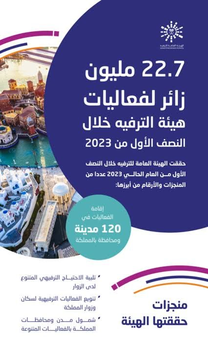 حققت الهيئة العامة للترفيه خلال النصف الأول من العام الجاري 2023 عددًا من المنجزات والأرقام، من أبرزها حضور 22.7 مليون زائر لفعالياتها التي تقاسمتها 120 مدينة ومحافظة في المملكة.