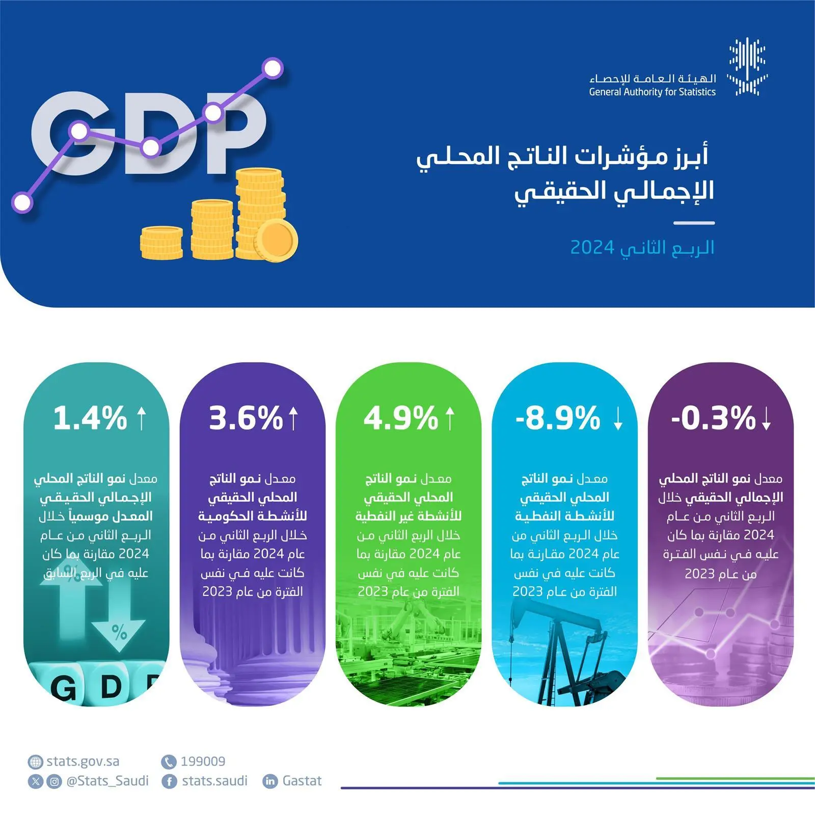 أصدرت الهيئة العامة للإحصاء اليوم، نشرة الناتج المحلي الإجمالي ومؤشرات الحسابات القومية للربع الثاني من عام 2024م، حيث شهدت الأنشطة غير النفطية، والأنشطة الحكومية نموًا بنسبة 4.9%، و3.6% على التوالي.