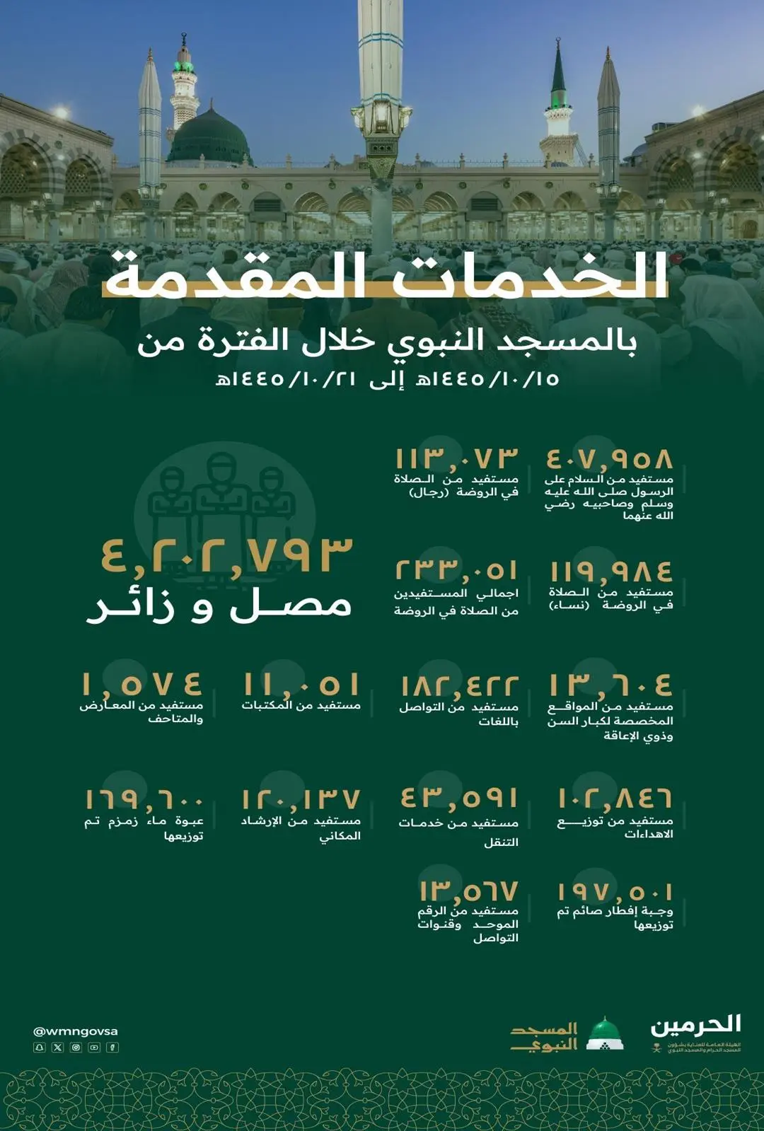 استقبل المسجد النبوي خلال الأسبوع الماضي أكثر من 4,202,793 مصليا وزائرًا لأداء فروض الصلوات اليومية، وسط خدمات متكاملة وفّرتها الهيئة العامة للعناية بشؤون المسجد النبوي، لخدمة المصلين والزائرين ورعايتهم.