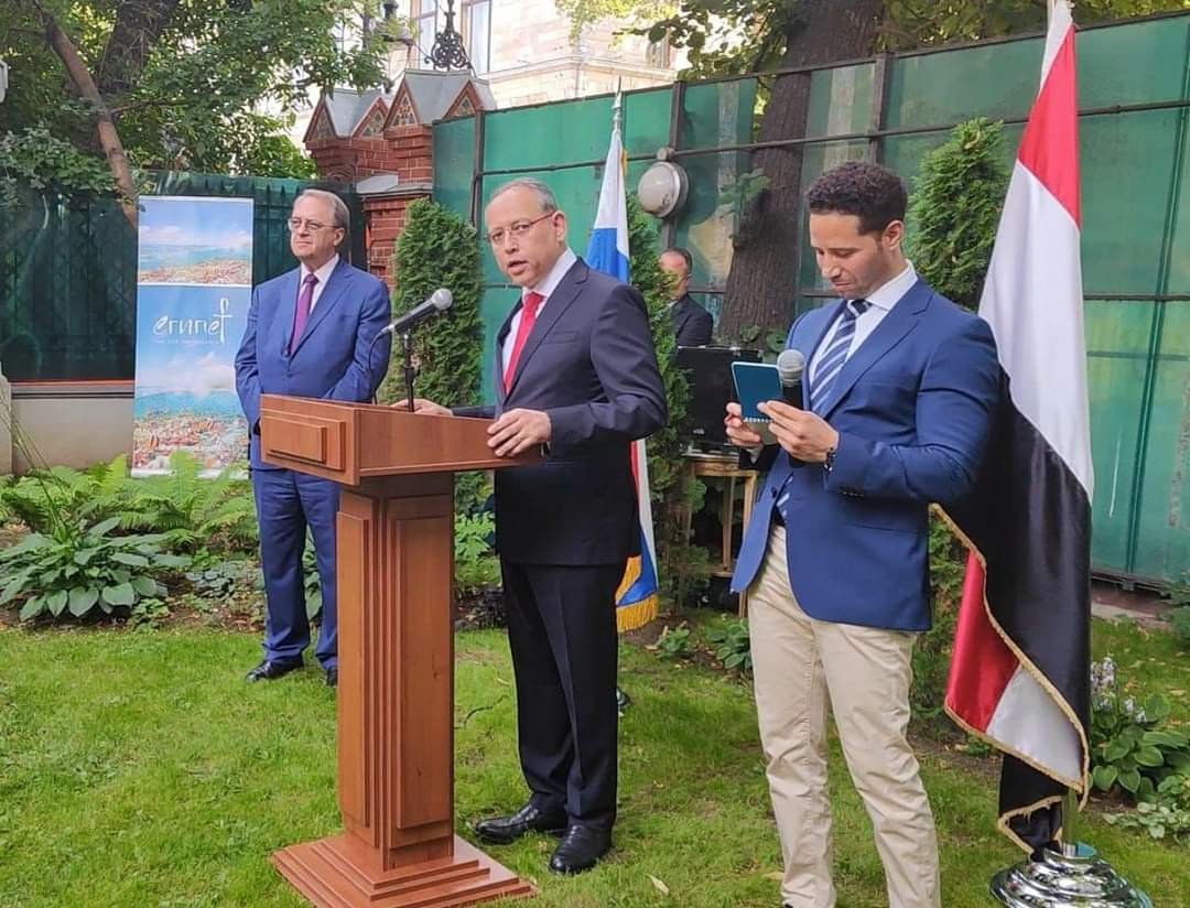 وألقى سفير مصر كلمة خلال الحفل أشاد فيها بالعلاقات الثنائية المتميزة والتاريخية بين مصر وروسيا، متناولاً أوجه التعاون بين البلدين في القطاعات المختلفة كالسياحة والطاقة والتجارة، وكذا تنفيذ مشروعات كبرى مثل مشروع محطة كهرباء الضبعة النووية، والمنطقة الصناعية الروسية بالمنطقة الاقتصادية بقناة السويس، موضحاً أن تلك المشروعات تأتي امتداداً للتعاون الذي كان قائماً بين مصر والاتحاد السوفييتي كمشروع بناء سد العالي في أسوان الذي بدأ عام ١٩٦٠.