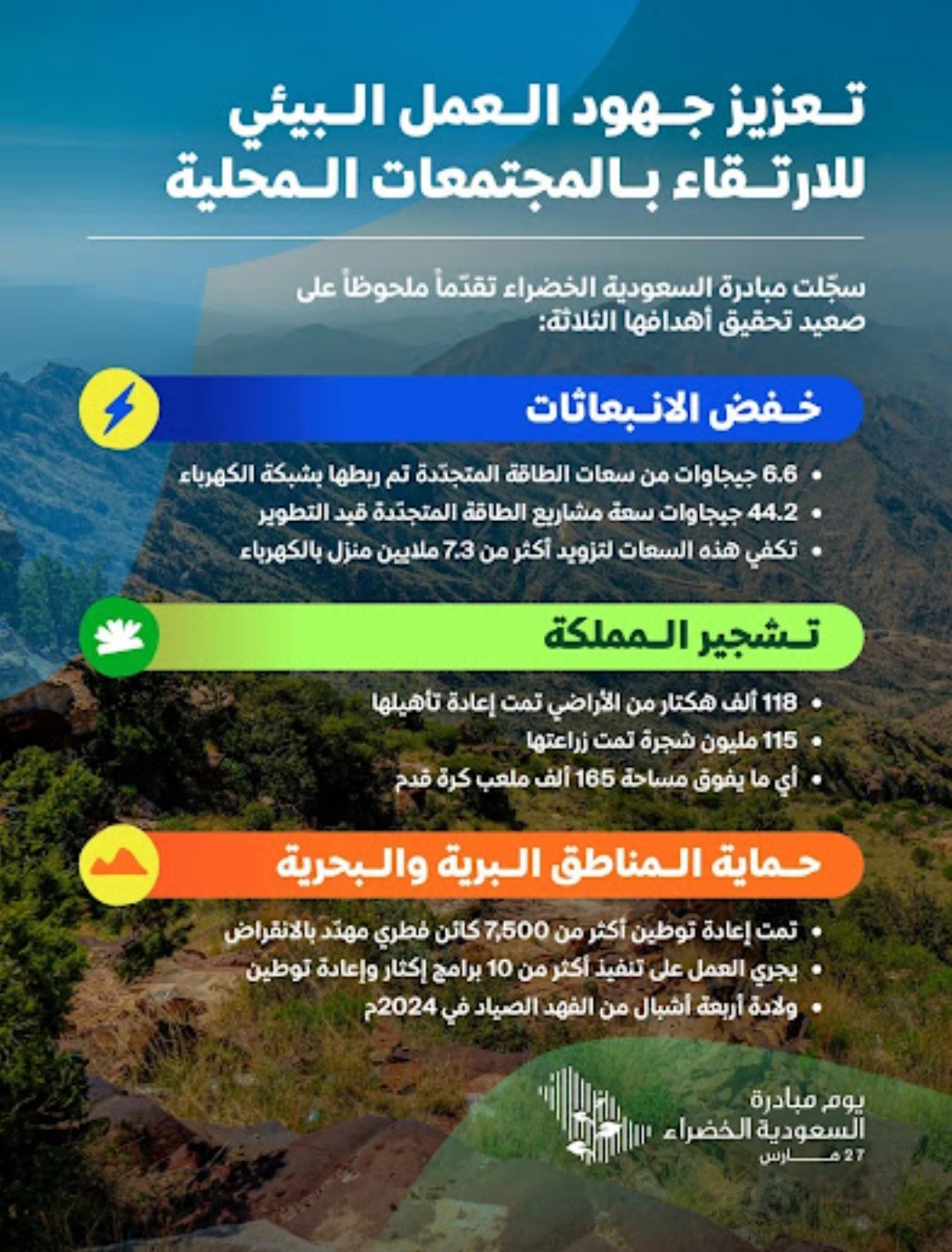 وبعد حملة انطلقت تحت شعار “ترسيخ ثقافة العمل البيئي”، يأتي يوم مبادرة السعودية الخضراء؛ للتأكيد على أهمية العمل الجماعي بين أفراد المجتمع والمؤسسات من مختلف القطاعات، بما في ذلك القطاع الحكومي والخاص وغير الربحي، بهدف التعامل مع التحديات البيئية الملحّة.