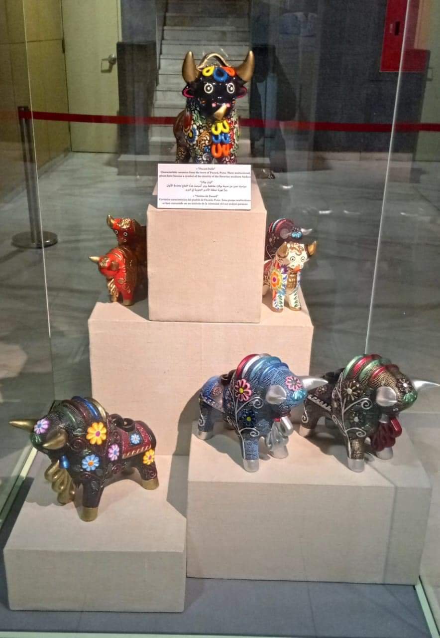 كما أضاف أنه من القطع الأساسية بالمعرض مجموعة خزفية لثور بوكارا والذى يعد رمزًا مهمًا في فولكلور دولة بيرو حيث يجسد القوة والمثابرة وتمنى الرخاء والحظ الجيد.