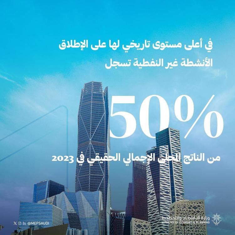 سجلت الأنشطة غير النفطية في المملكة العربية السعودية أعلى مساهمة لها في الناتج المحلي الإجمالي الحقيقي خلال عام 2023 بنسبة 50 % ، وهو أعلى مستوى تاريخي تصل إليه على الإطلاق، بناءً على تحليلات وزارة الاقتصاد و التخطيط للبيانات الصادرة من الهيئة العامة للإحصاء.