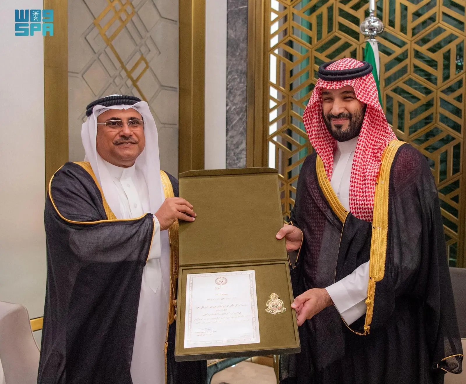 وقدم رئيس البرلمان العربي وسام القائد لسمو ولي العهد، تقديراً وعرفاناً من الشعب العربي لمواقف سموه الرائدة في الدفاع عن القضايا العربية، وتعزيز العمل العربي المشترك.