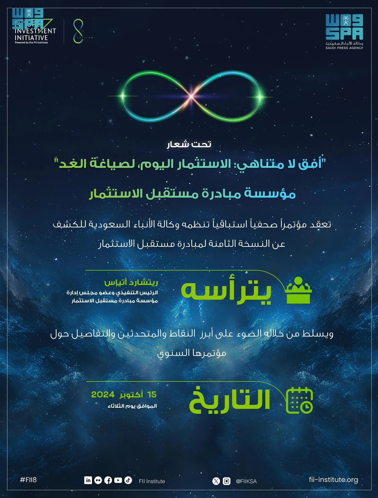 ويشارك في المؤتمر الصحفي الذي تستضيفه هيئة وكالة الأنباء السعودية بمركز المؤتمرات بمدينة الرياض، الرئيس التنفيذي وعضو مجلس إدارة مؤسسة مبادرة مستقبل الاستثمار ريتشارد أتياس، وقيادات المؤسسة، وعدد من ممثلي شركاء المؤسسة الاستراتيجيين وممثلي الصحافة والإعلام من مختلف دول العالم للحديث عن أبرز القضايا والتحديات التي تتناولها أعمال النسخة الثامنة، واستعراض أهمية شعار المؤتمر الذي يدعو لتوسيع مؤسسة مبادرة مستقبل الاستثمار واحتضان آفاق المستقبل غير المحدود، والتزامها بقيادة المحادثات التي تؤدي إلى مستقبل حيث لا يعرف الاستثمار حدودًا والعمل نحو غدٍ أفضل للجمي