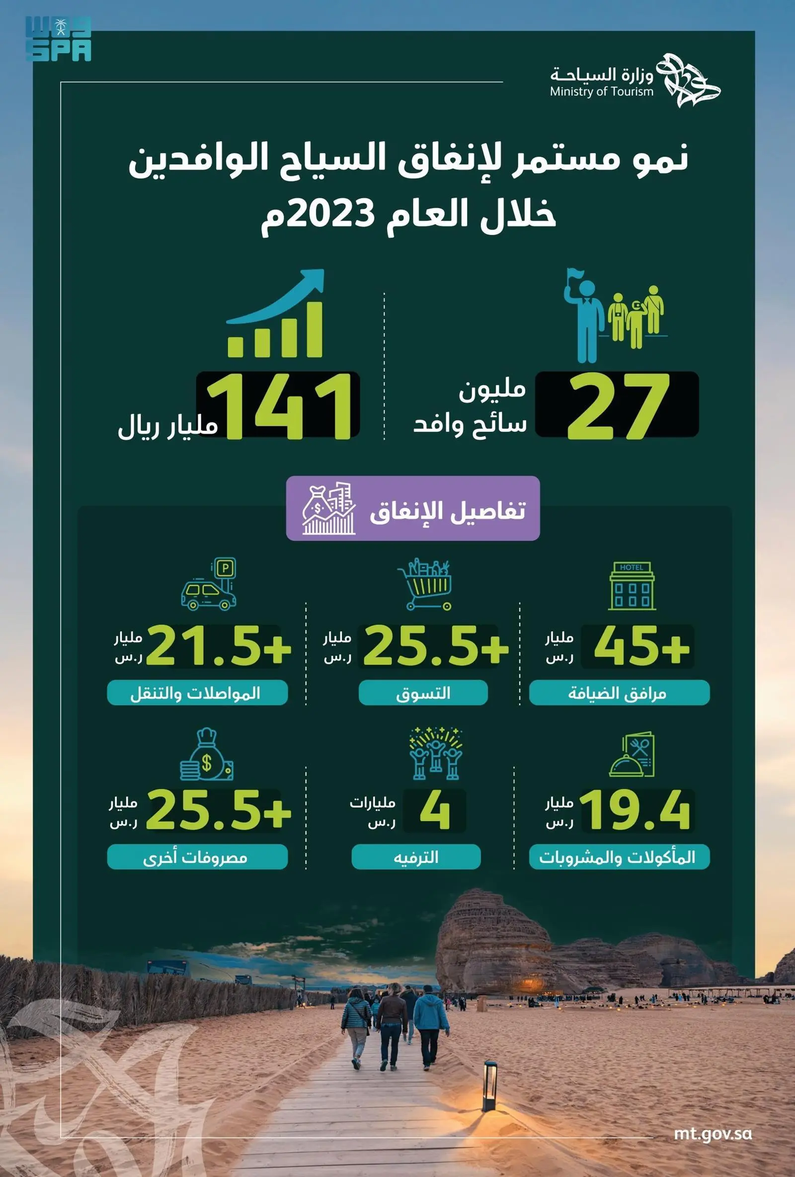 السياحة السعودية: 141 مليار ريال إجمالي إنفاق السياح الوافدين إلى المملكة من الخارج خلال العام 2023م