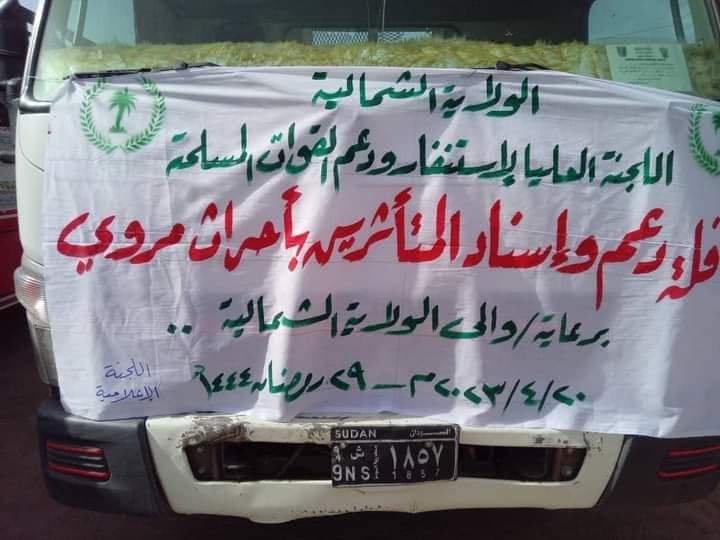 سيرت اللجنة العليا للاستنفار ودعم القوات المسلحة بالولاية الشمالية أولى قوافها لمدينة مروي اليوم حيث شهد وداع القافلة والي الولاية الشمالية الاستاذ الباقر احمد علي ورئيس اللجنة العليا للاستنفار ودعم القوات المسلحة المهندس عمر علي صالح وعدد من أعضاء اللجنة، واشتملت القافلة على بعض المواد العينية والملابس وسيارات للاسعافات الأولية .