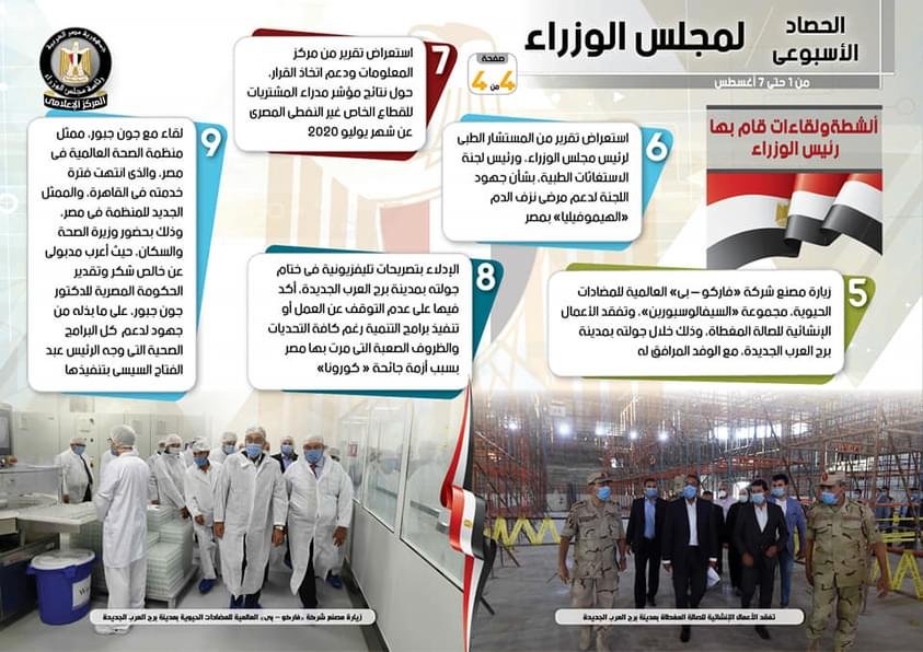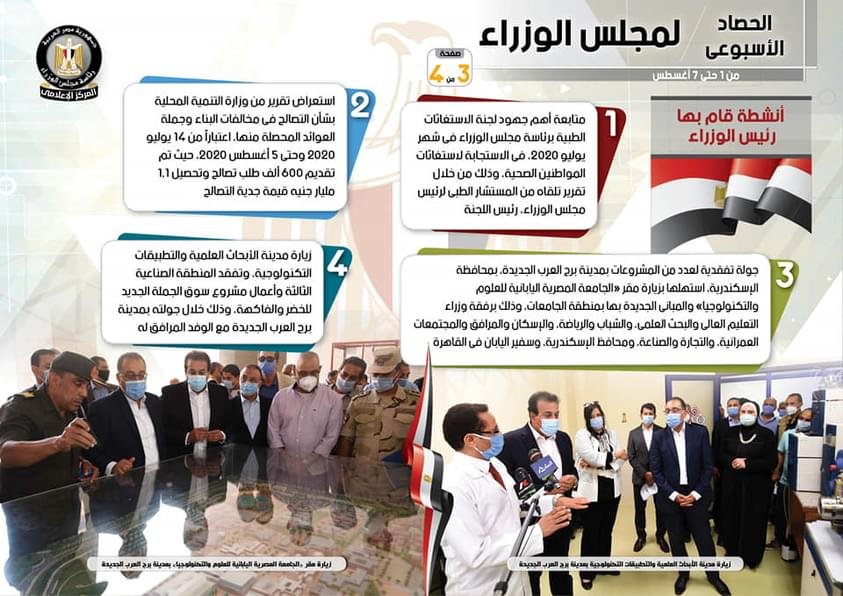 أصدر المركز الإعلامي لمجلس الوزراء، تقريراً تضمن إنفوجرافاً سلط من خلاله الضوء على الحصاد الأسبوعي لمجلس الوزراء، وذلك خلال الفترة من 1 حتى 7 أغسطس 2020، والذي تضمن الموافقة على عدد من القرارات، فضلاً عن الاجتماعات واللقاءات التي عقدها الدكتور مصطفى مدبولي، رئيس مجلس الوزراء، بالإضافة إلى ما قام به سيادته من أنشطة.