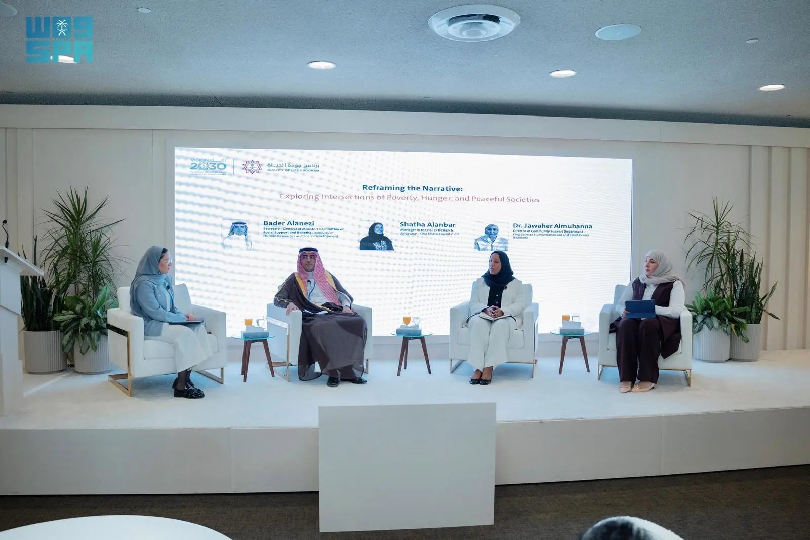 وتحدثت الدكتورة جواهر آل مهنا خلال الجلسة عن مركز الملك سلمان للإغاثة والأعمال الإنسانية وعن جهوده في تحقيق رؤية المملكة 2030 مع أهداف التنمية المستدامة، وتحديدًا الهدف الأول المتعلق بالقضاء على الفقر حيث قدم المركز مساعدات بقيمة مليار