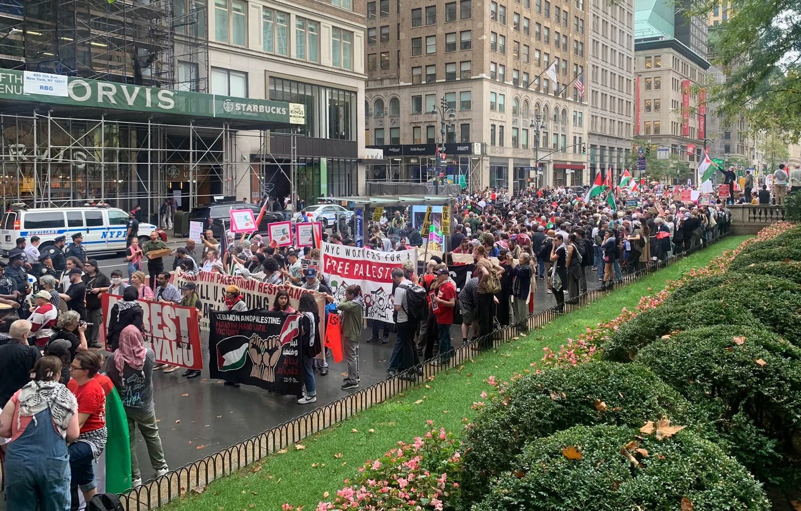 خرجت مظاهرات حاشدة في نيويورك، اليوم /الجمعة/، بالتزامن مع كلمة رئيس الوزراء الإسرائيلي بنيامين نتنياهو أمام الجمعية العامة للأمم المتحدة، حيث نظمت مجموعات مختلفة احتجاجات طالبت بإنهاء الحرب في غزة والإفراج عن المحتجزين.