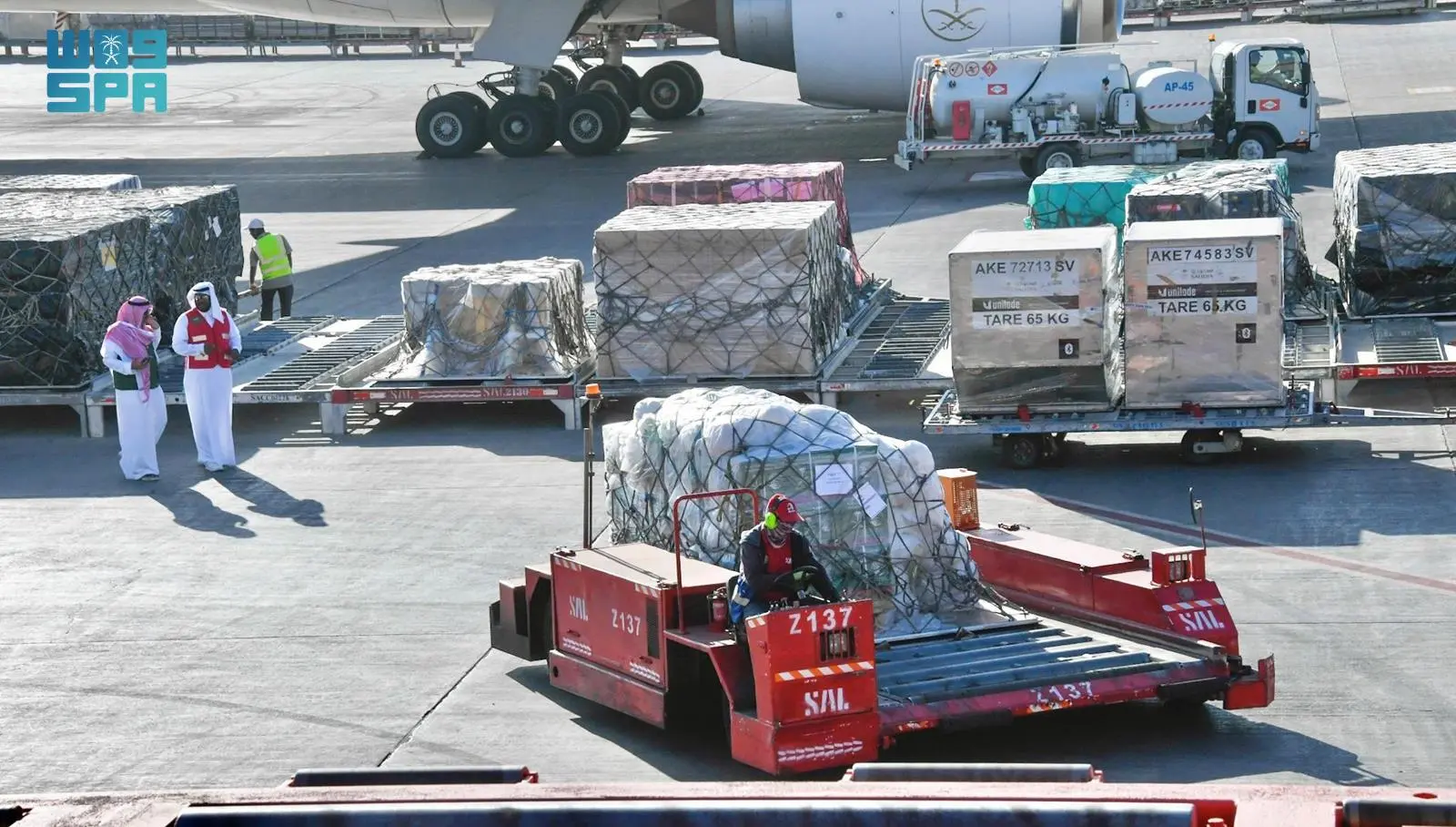 غادرت مطار الملك خالد الدولي بالرياض اليوم الطائرة الإغاثية السعودية الأولى متجهة إلى مطار العريش الدولي بجمهورية مصر العربية تمهيداً لنقلها إلى المتضررين داخل قطاع غزة، تحمل على متنها مساعدات إغاثية متنوعة شملت مواد إغاثية وإيوائية بوزن إجمالي يبلغ 35 طناً، وذلك ضمن الحملة الشعبية لإغاثة الشعب الفلسطيني الشقيق في قطاع غزة، والتي وجه بها خادم الحرمين الشريفين الملك سلمان بن عبدالعزيز آل سعود وصاحب السمو الملكي الأمير محمد بن سلمان بن عبدالعزيز ولي العهد رئيس مجلس الوزراء -حفظهما الله-.