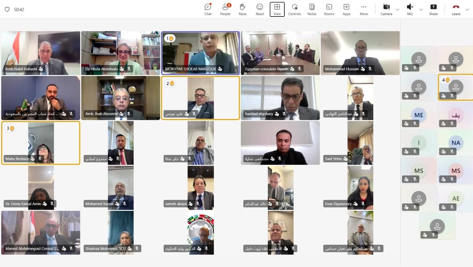 وفي مستهل اللقاء، أشار نائب وزير الخارجية إلى ضرورة تكثيف التواصل المباشر مع أبناء الجاليات المصرية في دول الخليج والمشرق العربي، لمتابعة أوضاعهم والاطمئنان عليهم بصورة مستمرة وتقديم كافة أوجه الرعاية والدعم اللازمة، لا سيما في ظل الظروف الاستثنائية الراهنة، وأوضح أن أوضاع الجاليات المصرية في دول الخليج والمشرق العربي مطمئنة بشكل عام، مؤكداً في الوقت ذاته أهمية الالتزام بالتعليمات والقوانين الصادرة عن السلطات السعودية، كما أشاد بالدور الذي تضطلع به كل من السفارة المصرية في الرياض والقنصليات في جدة والرياض لمساعدة أبناء الجالية المصرية في السعودية وتقديم كافة أوجه الدعم وتسهيل المعاملات القنصلية للتيسير عليهم وضمان سلامتهم.