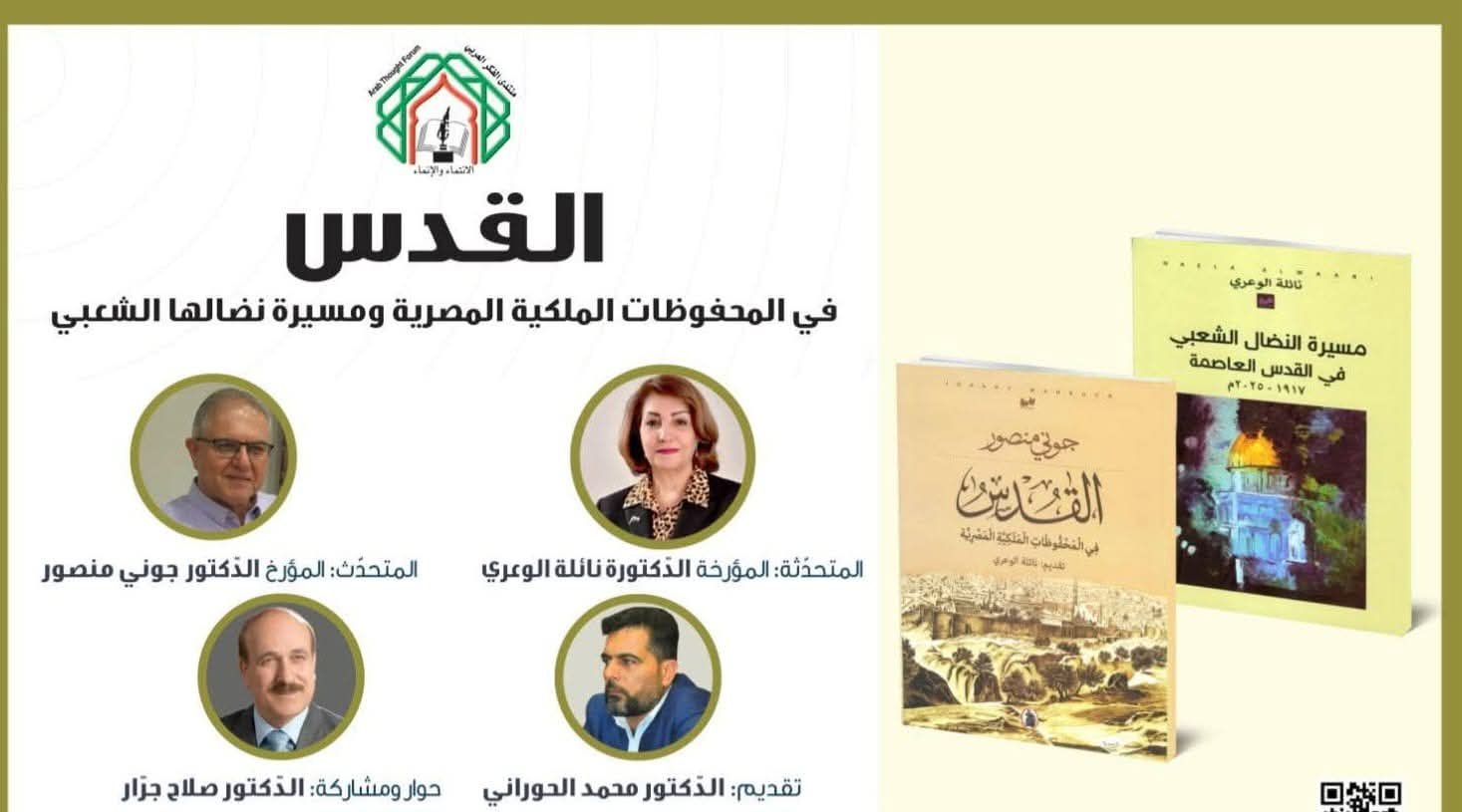 جاء ذلك خلال ندوة نظمها منتدى الفكر العربي في العاصمة الأردنية عمّان ، بحضور المؤرخة الدكتورة نائلة الوعري، ونخبة من الخبراء والمتخصصين ،وبتقديم الدكتور محمد الحوراني، ومشاركة الدكتور صلاح جرار.