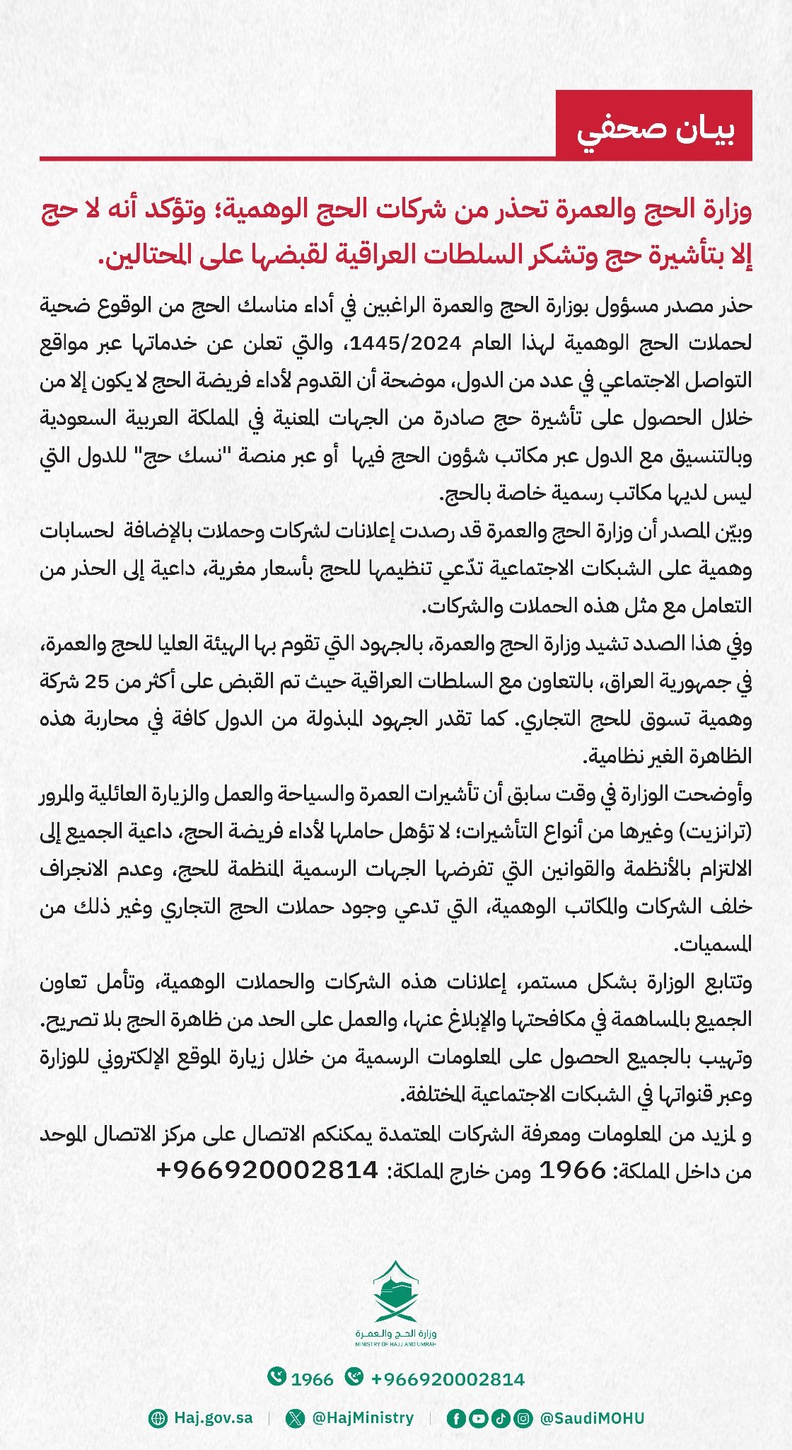 وفي هذا الصدد، تشيد وزارة الحج والعمرة بالجهود التي تقوم بها الهيئة العليا للحج والعمرة في جمهورية العراق بالتعاون مع السلطات العراقية، حيث تم القبض على أكثر من ٢٥ شركة وهمية تسوق للحج التجاري. كما تقدر الجهود المبذولة من الدول كافة في محاربة هذه الظاهرة الغير نظامية.