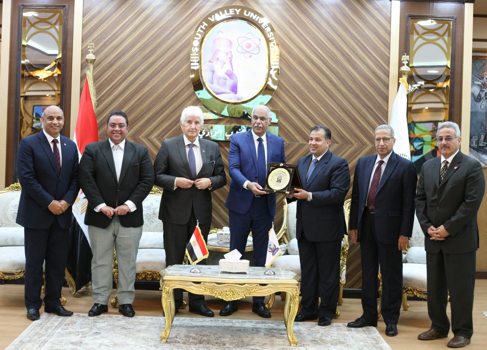 اهدى الدكتور احمد عكاوي رئيس جامعة جنوب الوادي درع الجامعة للأستاذ جمال علام رئيس مجلس ادارة الاتحاد المصري لكرة القدم الذي يشارك بافتتاح فعاليات البطولة العربية الثامنة عشر لخماسيات كرة القدم جاء ذلك بحضور الدكتور بدوي شحات نائب رئيس الجامعة لشئون التعليم والطلاب و الدكتور كريم همام مستشار وزير التعليم العالي للأنشطة الطلابية و الدكتور صبحي حسانين النائب الاول لرئيس الاتحاد الرياضي للجامعات والدكتور عرفة سلامة سكرتير الاتحاد الرياضي للجامعات و الدكتور اشرف موسى مدير البطولة العربية لخماسيات كرة القدم