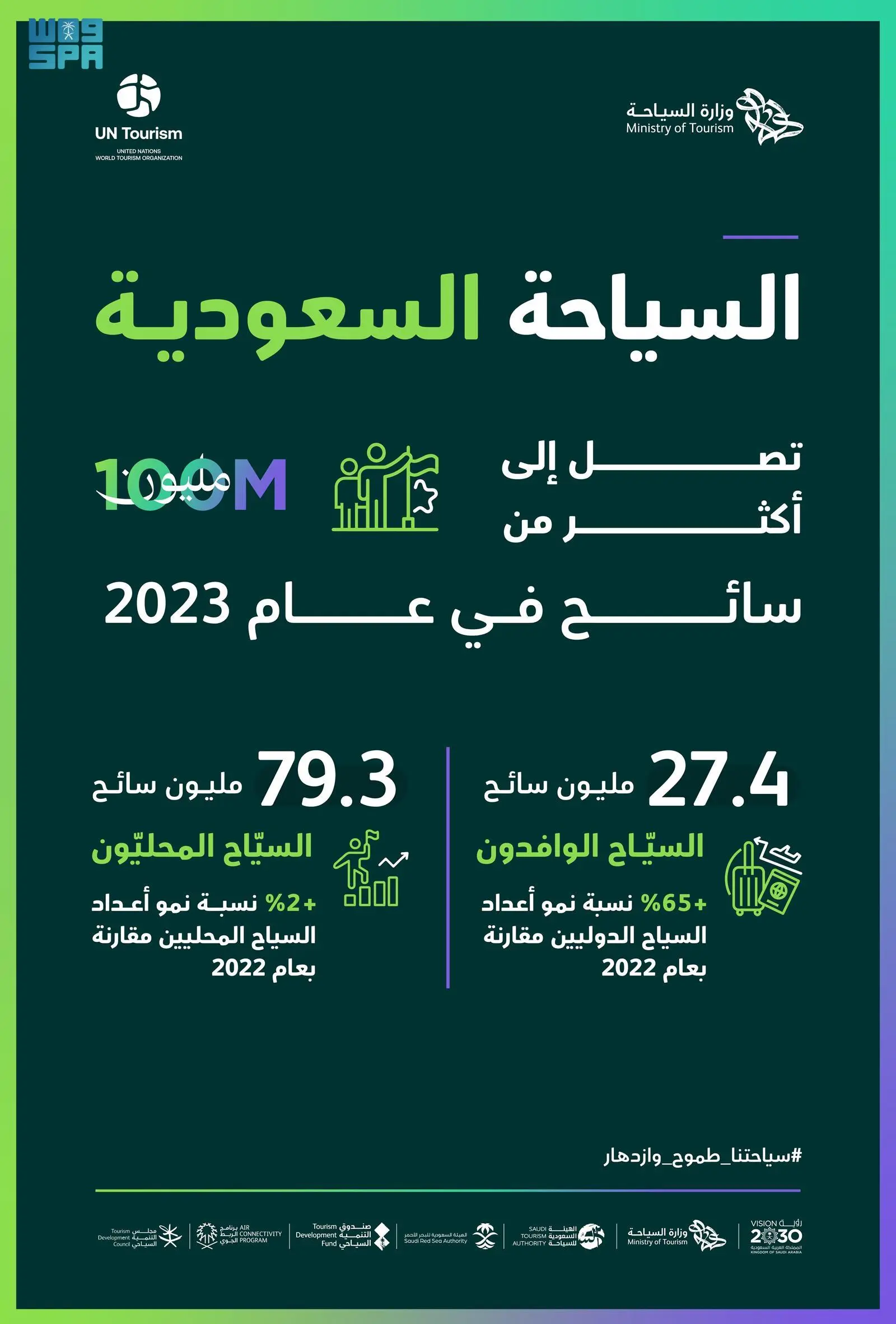 وكشفت وزارة السياحة عن أرقام غير مسبوقة تحققت خلال العام 2023 حيث تجاوز عدد سياح الداخل والخارج 100 مليون سائح وذلك مع نهاية عام 2023، وأنفقوا أكثر من 250 مليار ريال، وهذا يمثل أكثر من 4 ٪ من الناتج المحلي الإجمالي، ويمثل أكثر من 7% من الناتج المحلي غير النفطي.