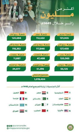 استقبل مجمع الملك فهد لطباعة المصحف الشريف بالمدينة المنورة 1.019.494 زائرًا من جنسياتٍ متعددة من الحجاج والمعتمرين والزائرين وذلك خلال العام الماضي 1445 هـ، حيث تعرفوا خلالها على آلية ومراحل طباعة المصحف الشريف والتي تبلغ 20 مليون نسخة سنويًا.